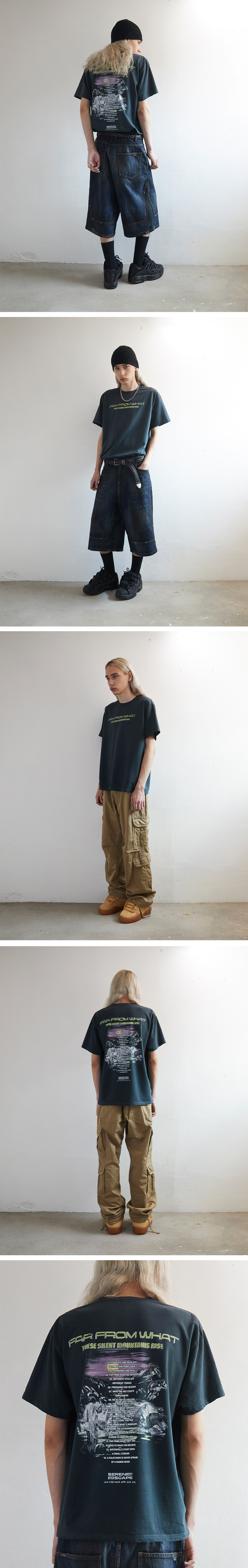 프론트에 FAR FROM WHAT 로고와 슬로건을 배치하고, 백 라인에는 투어 티셔츠 무드를 담은 그래픽을 더한 티셔츠입니다. 워싱된 바디 컬러와 빈티지한 프린트가 자연스럽게 어우러져 거친 스트릿 무드를 완성합니다. 단독 또는 레이어드 스타일링에 모두 적합합니다.