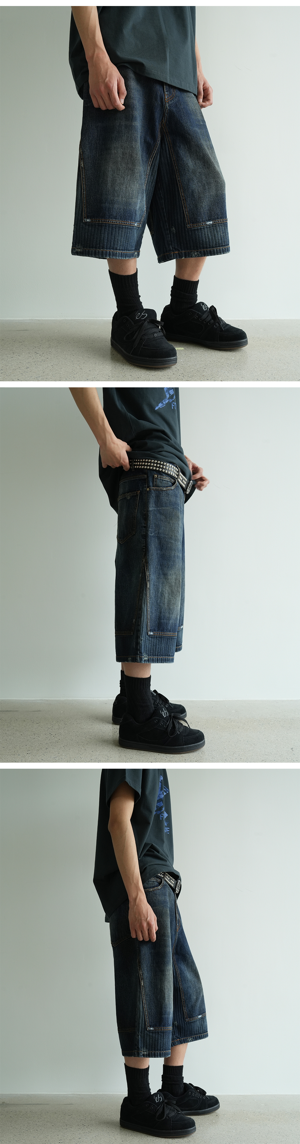 두 가지 다른 원단을 믹스해 제작된 벌룬 실루엣의 와이드 데님 버뮤다 팬츠입니다. 무릎 아래 절개선과 입체적인 패턴이 자연스러운 볼륨을 완성하며, 빈티지한 워싱과 묵직한 인디고 컬러가 조화를 이룹니다. 옆라인 퍼짐 없이 깔끔하게 떨어지는 구조로 스트릿 무드부터 캐주얼 스타일링까지 폭넓게 연출할 수 있습니다.