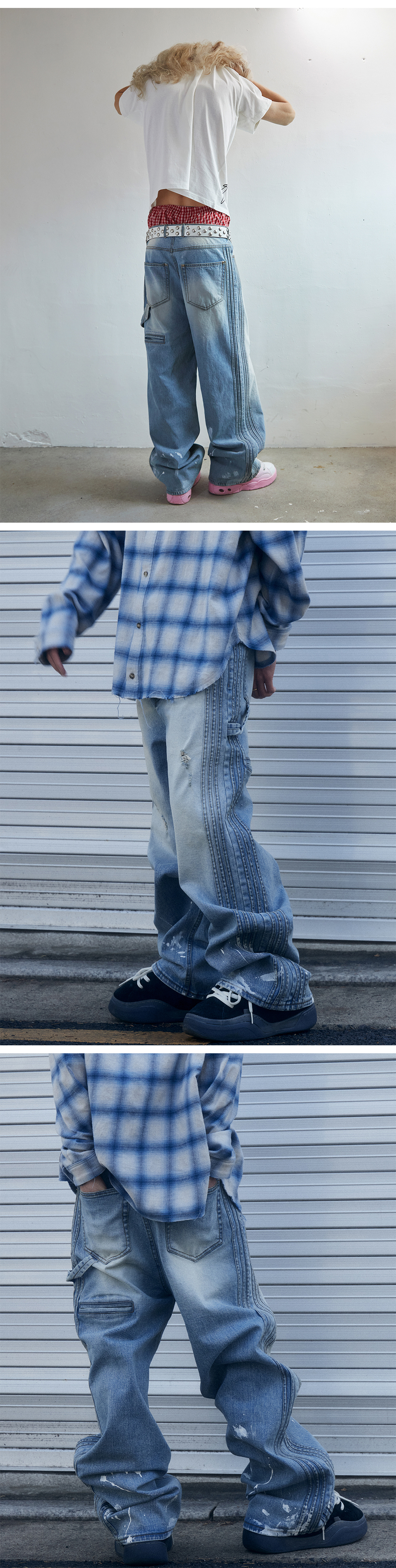 옆선 전체에 다중 스티치 디테일을 적용해 입체감을 살린 와이드 핏 데님 팬츠입니다. 뒷포켓에 해머 루프 디테일을 더해 워크웨어 무드를 강조했으며, 밑단에는 페인팅 가공을 추가해 빈티지한 느낌을 완성했습니다. 자연스러운 워싱과 데미지 디테일이 조화를 이루는 디자인입니다.