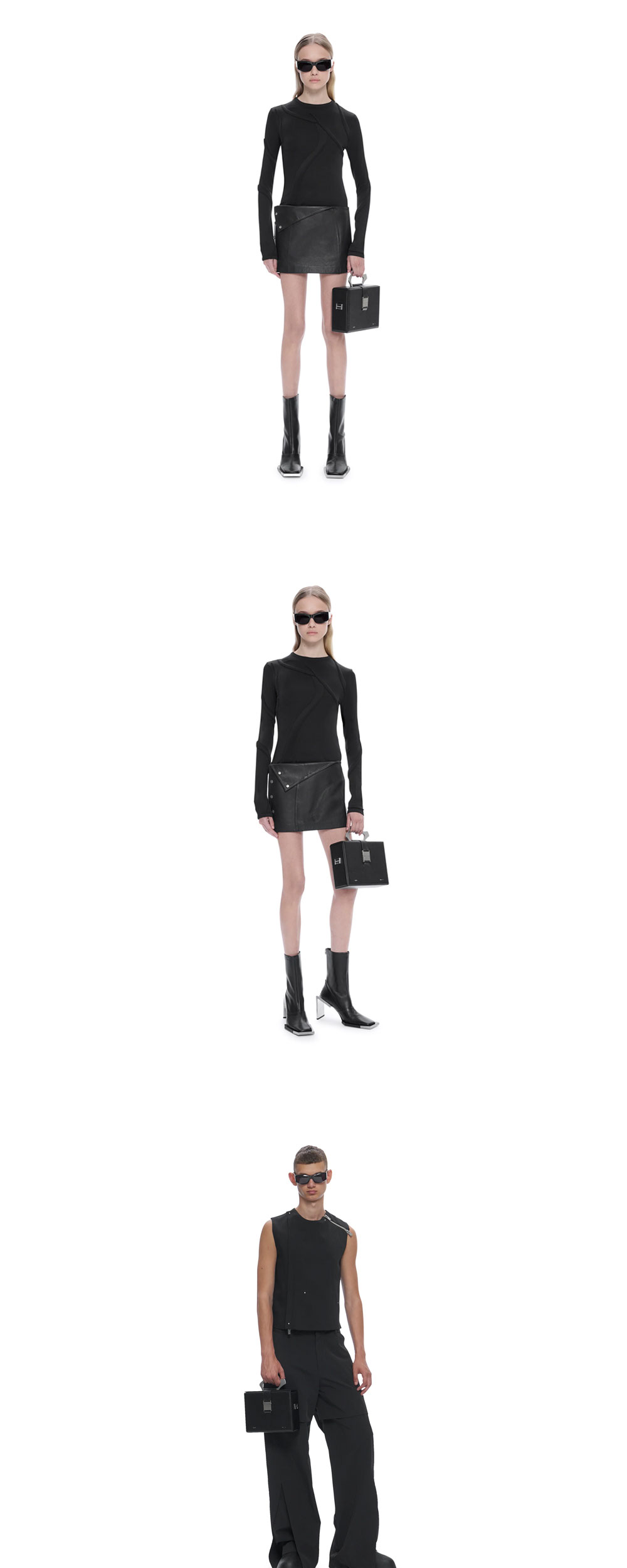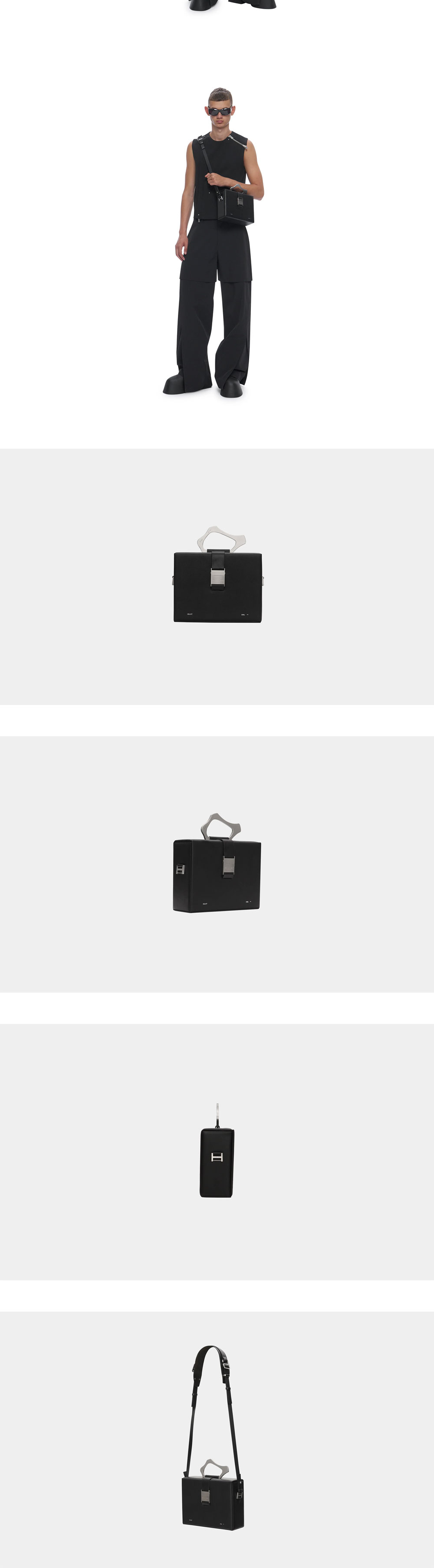 시그니처 엘리엇 에밀 박스 백의 새로운 버전인 엘리엇 에밀의 솔리 라지 박스 백 블랙입니다. - 견고한 가죽 박스 구조에 숄더 스트랩과 새로운 금속 카라비너 핸들이 추가된 디자인 - 조절 가능한 스트랩 - 금속 스냅 버틀 잠금 장식 - 전면의 브랜드 로고 디테일