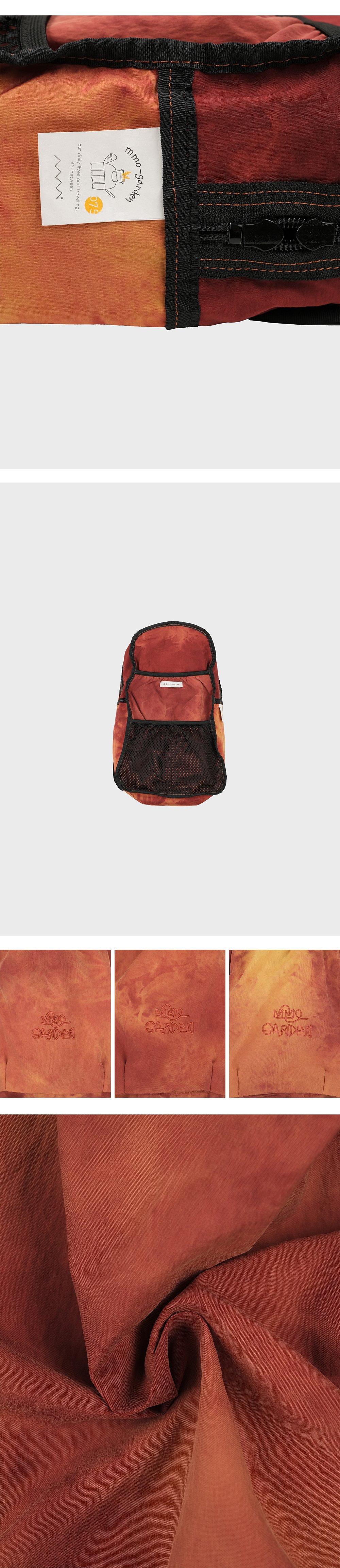 * 나일론 원단에 일정한 형식을 두지않고 자유롭게 타이다이 염색을 진행하여 제작한 특성상 상세이미지와 판매되는 모든 제품의 컬러(무늬)가 다른 점 확인 후 구매 부탁드립니다. (해당 사유는 불량이 아님으로 무상 교환 및 반품이 어렵습니다.) 에메모만의 이야기로 풀어낸 ‘똑같은 컬러가 없는, 단 하나뿐인 나만의 타이다이 백팩’ - 아침 해가 떠오르는 순간을 담은 선라이즈 컬러 - 발수 가공 처리로 가벼운 생활방수 가능 - 나일론 특유의 바스락거림과 에메모에서 추구하는 처지는 쉐입의 백팩 - 내부 태블릿 포켓과 메쉬 원단의 투 포켓, 외부 양 사이드포켓과 전면 스트링 포켓으로 구성 - 075 > 아이패드 11인치 수납 가능 - 탈부착 가능한 가슴 끈에 위급한 상황시 사용할 수 있는 휘슬이 달려있습니다. - 에메모가든이 각인된 카라비너에 모자, 소품 등을 걸어 포인트를 줄 수 있습니다. - 전면 스트링 포켓으로 가방을 뒤집어 넣어 패커블이 가능합니다. (바깥 면에서는 사각형의 스티치 라인만 보입니다.)