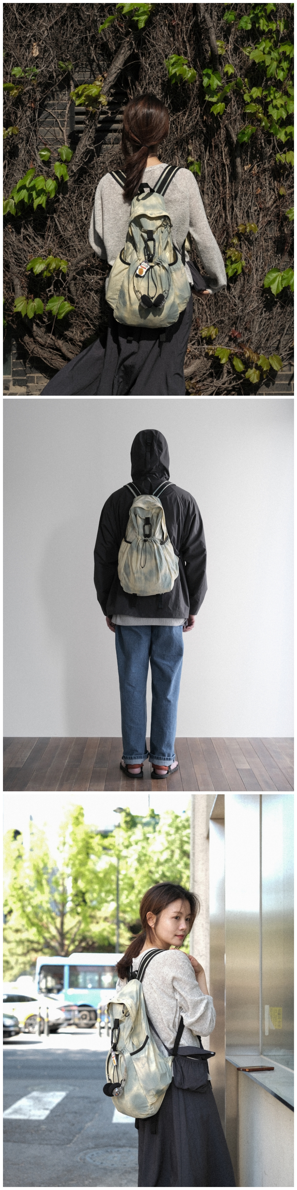 * 나일론 원단에 일정한 형식을 두지않고 자유롭게 타이다이 염색을 진행하여 제작한 특성상 상세이미지와 판매되는 모든 제품의 컬러(무늬)가 다른 점 확인 후 구매 부탁드립니다. (해당 사유는 불량이 아님으로 무상 교환 및 반품이 어렵습니다.) 에메모만의 이야기로 풀어낸 ‘똑같은 컬러가 없는, 단 하나뿐인 나만의 타이다이 백팩’ - 치즈처럼 부드러운 컬러감의 블루치즈 컬러 - 발수 가공 처리로 가벼운 생활방수 가능 - 나일론 특유의 바스락거림과 에메모에서 추구하는 처지는 쉐입의 백팩 - 내부 태블릿 포켓과 메쉬 원단의 투 포켓, 외부 양 사이드포켓과 전면 스트링 포켓으로 구성 - 085 > 맥북 13인치 수납 가능 - 탈부착 가능한 가슴 끈에 위급한 상황시 사용할 수 있는 휘슬이 달려있습니다. - 에메모가든이 각인된 카라비너에 모자, 소품 등을 걸어 포인트를 줄 수 있습니다. - 전면 스트링 포켓으로 가방을 뒤집어 넣어 패커블이 가능합니다. (바깥 면에서는 사각형의 스티치 라인만 보입니다.)
