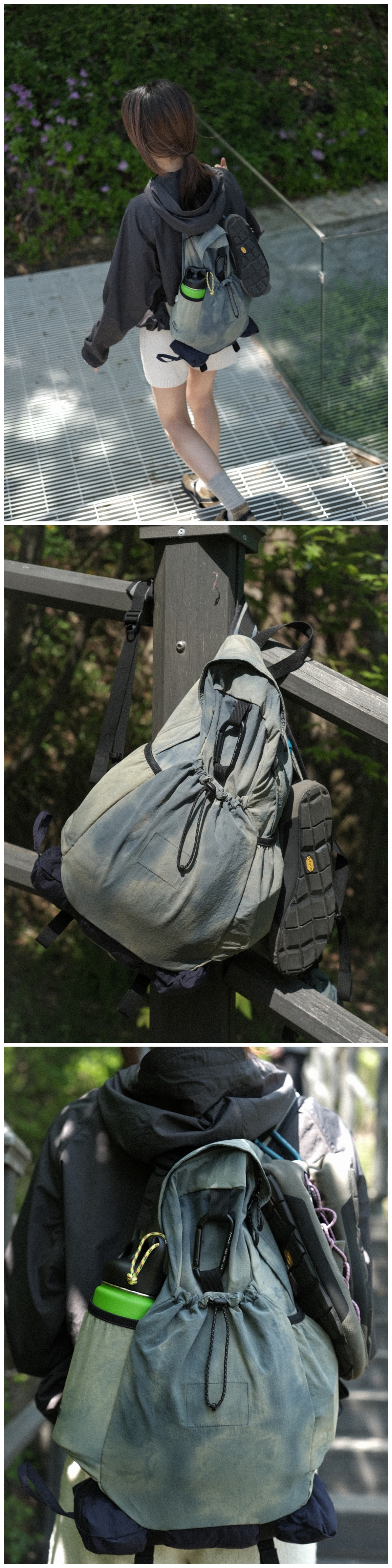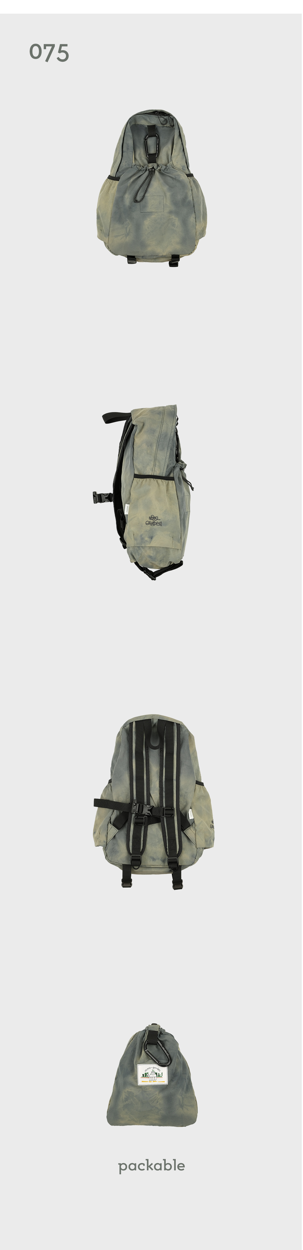 * 나일론 원단에 일정한 형식을 두지않고 자유롭게 타이다이 염색을 진행하여 제작한 특성상 상세이미지와 판매되는 모든 제품의 컬러(무늬)가 다른 점 확인 후 구매 부탁드립니다. (해당 사유는 불량이 아님으로 무상 교환 및 반품이 어렵습니다.) 에메모만의 이야기로 풀어낸 ‘똑같은 컬러가 없는, 단 하나뿐인 나만의 타이다이 백팩’ - 안개 낀 밤이 연상되는 포기나잇 컬러 - 발수 가공 처리로 가벼운 생활방수 가능 - 나일론 특유의 바스락거림과 에메모에서 추구하는 처지는 쉐입의 백팩 - 내부 태블릿 포켓과 메쉬 원단의 투 포켓, 외부 양 사이드포켓과 전면 스트링 포켓으로 구성 - 075 > 아이패드 11인치 수납 가능 - 탈부착 가능한 가슴 끈에 위급한 상황시 사용할 수 있는 휘슬이 달려있습니다. - 에메모가든이 각인된 카라비너에 모자, 소품 등을 걸어 포인트를 줄 수 있습니다. - 전면 스트링 포켓으로 가방을 뒤집어 넣어 패커블이 가능합니다. (바깥 면에서는 사각형의 스티치 라인만 보입니다.)
