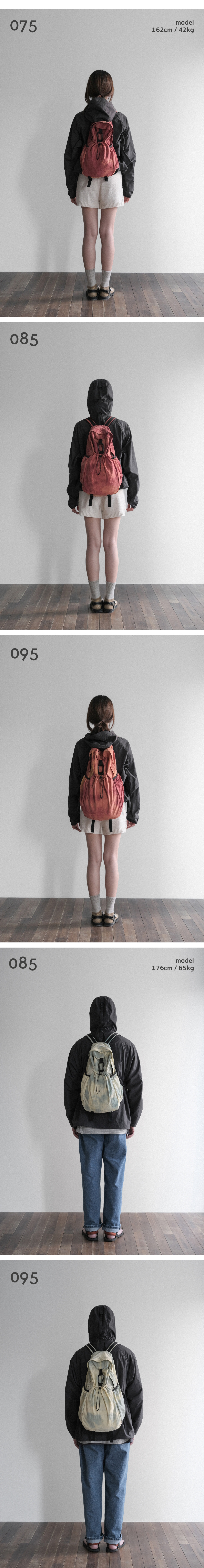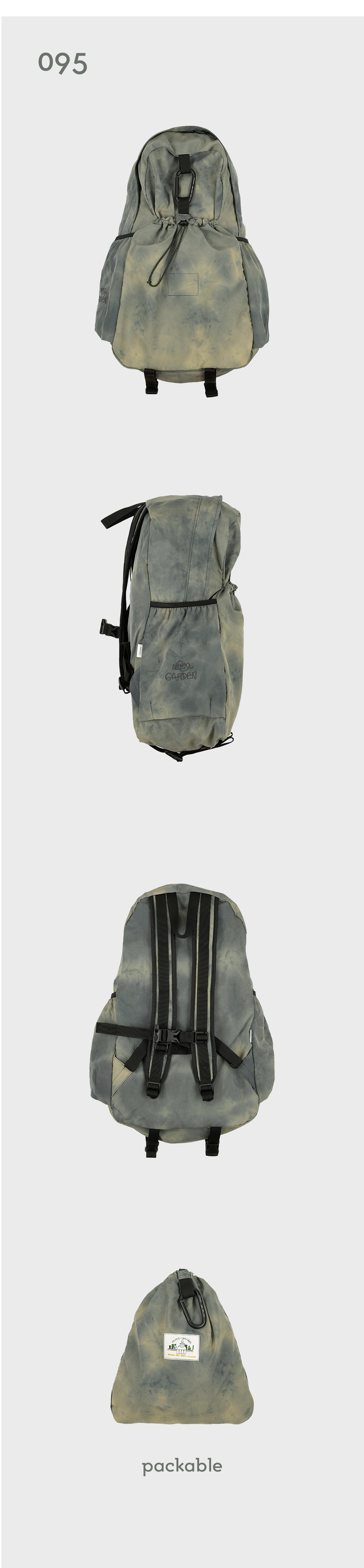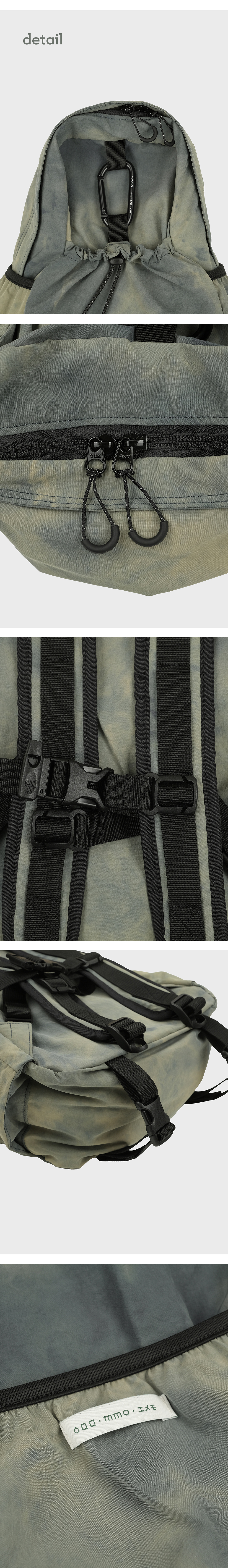 * 나일론 원단에 일정한 형식을 두지않고 자유롭게 타이다이 염색을 진행하여 제작한 특성상 상세이미지와 판매되는 모든 제품의 컬러(무늬)가 다른 점 확인 후 구매 부탁드립니다. (해당 사유는 불량이 아님으로 무상 교환 및 반품이 어렵습니다.) 에메모만의 이야기로 풀어낸 ‘똑같은 컬러가 없는, 단 하나뿐인 나만의 타이다이 백팩’ - 안개 낀 밤이 연상되는 포기나잇 컬러 - 발수 가공 처리로 가벼운 생활방수 가능 - 나일론 특유의 바스락거림과 에메모에서 추구하는 처지는 쉐입의 백팩 - 내부 태블릿 포켓과 메쉬 원단의 투 포켓, 외부 양 사이드포켓과 전면 스트링 포켓으로 구성 - 095 > 맥북 14인치 수납 가능 - 탈부착 가능한 가슴 끈에 위급한 상황시 사용할 수 있는 휘슬이 달려있습니다. - 에메모가든이 각인된 카라비너에 모자, 소품 등을 걸어 포인트를 줄 수 있습니다. - 전면 스트링 포켓으로 가방을 뒤집어 넣어 패커블이 가능합니다. (바깥 면에서는 사각형의 스티치 라인만 보입니다.)