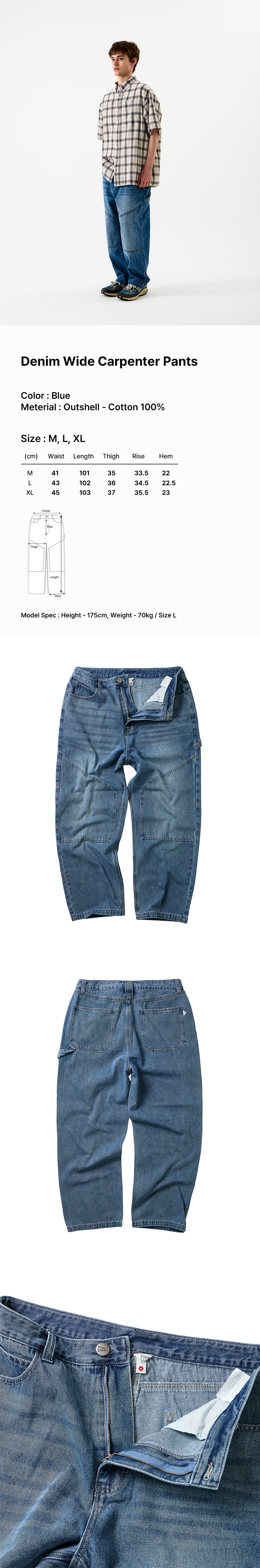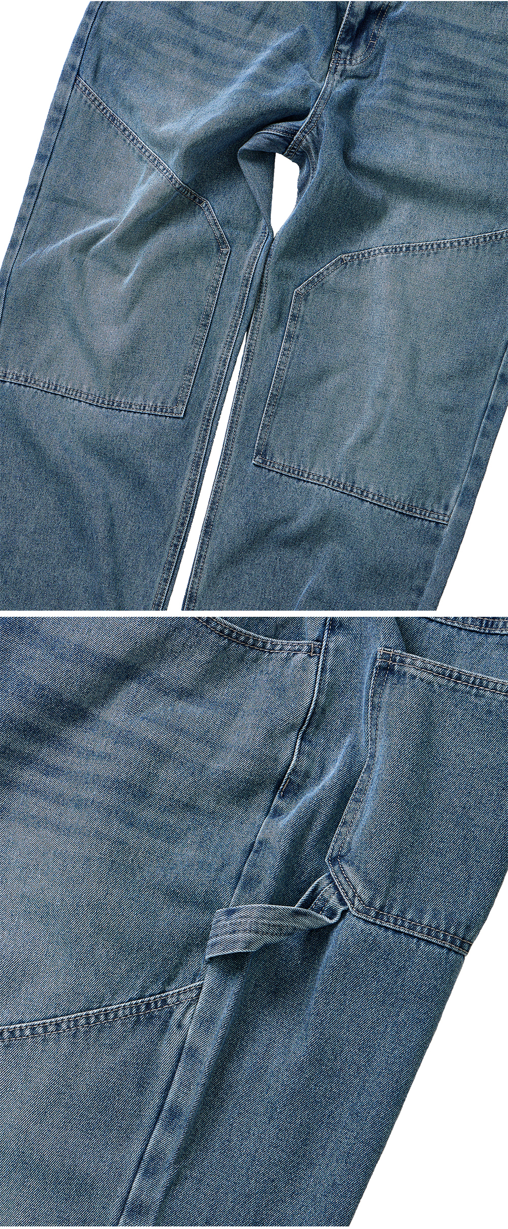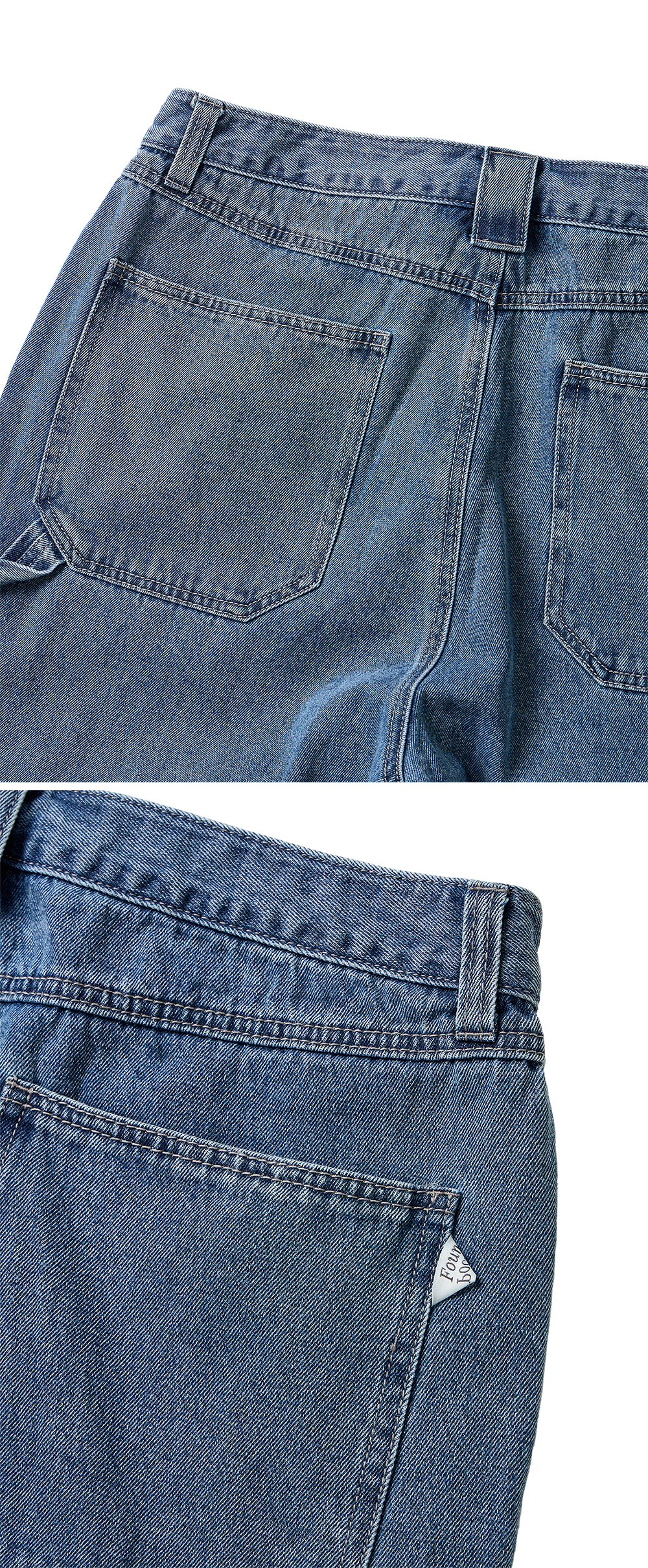 전통적인 카펜터 팬츠 특성 반영 실용적인 포켓 디자인과 여유로운 핏 부드럽고 내구성이 뛰어난 데님 원단 사용 이중 봉제선으로 무릎 내구성과 보호력 강화 담백한 형태의 벨트 루프와 버튼 디테일