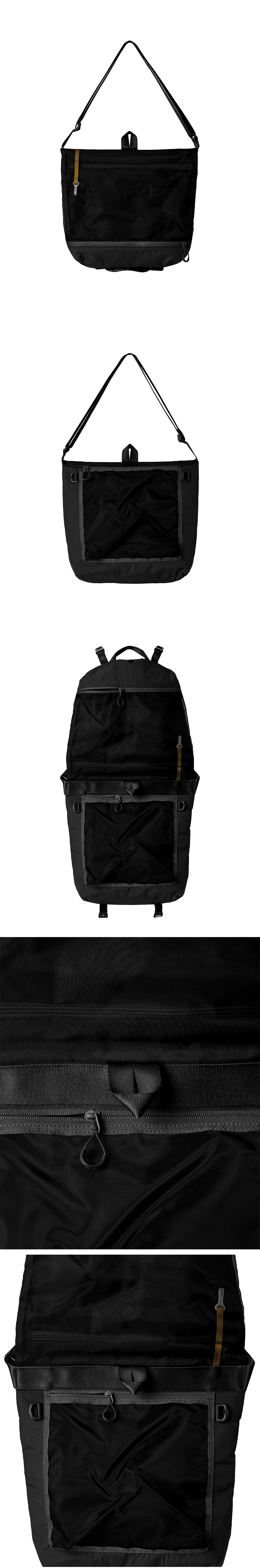 가볍게 둘러메기 좋은 대칭형 디자인의 크로스백 완전히 펼쳐지는 디자인으로 일상과 여행 시 펼쳐 걸어두고 빠르게 사용 가능 메쉬 원단으로 제작된 내부는 직관적인 사용이 가능하고 편의성 극대화 작은 소지품을 걸어둘 수 있는 내부 노란색 키 링 디테일과 D링 고정하거나 개방할 수 있는 실용적인 하단 버클