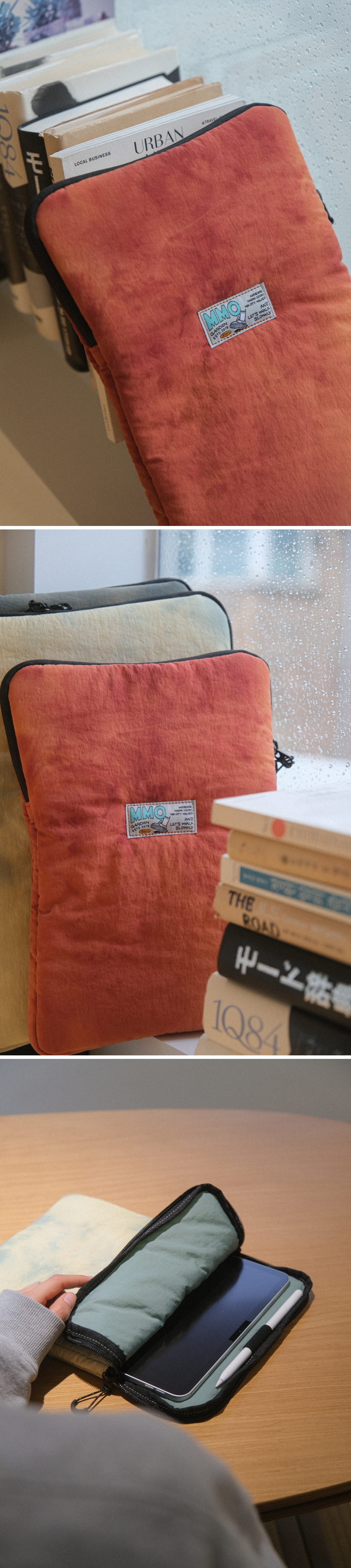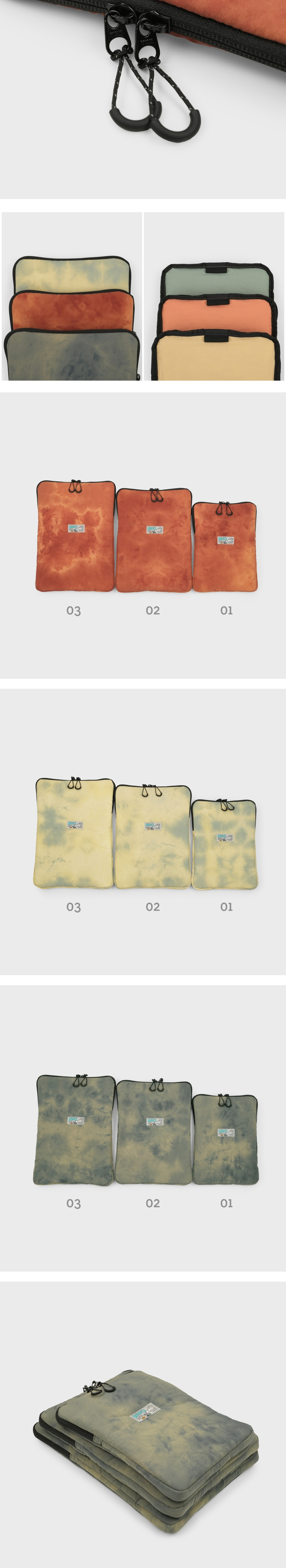 *나일론 원단에 일정한 형식을 두지않고 자유롭게 타이다이 염색을 진행하여 제작한 특성상 상세이미지와 판매되는 모든 제품의 컬러(무늬)가 다른 점 확인 후 구매 부탁드립니다. (해당 사유는 불량이 아님으로 제품 특성상 무상 교환 및 반품이 어렵습니다.) 에메모만의 이야기로 풀어낸 ‘똑같은 컬러가 없는, 단 하나뿐인 나만의 타이다이 파우치’ - 발수 가공 처리로 가벼운 생활방수 가능 - 나일론 특유의 바스락 거림과 질감은 매트하지만 촉감은 부드러운 원단 - 4온스 충전재를 사용하여 가벼운 무게, 적당한 두께감과 푹신함 - 에메모 사각 라벨 포인트 에메모 백팩 전용 사이즈로 제작된 태블릿 & 랩탑 파우치 - 095 사이즈 : 03 사이즈 (맥북 14”) 이외 태블릿 및 랩탑은 아래 제품 사이즈표를 참고해 주세요. 에메모 백팩용으로 무게는 가볍게, 가방 내부 포켓에 넣고 빼기 편하도록 디자인을 최소화하고 수납 시 가방의 형태를 최대한 해치지 않는 사이즈로 제작하였습니다.