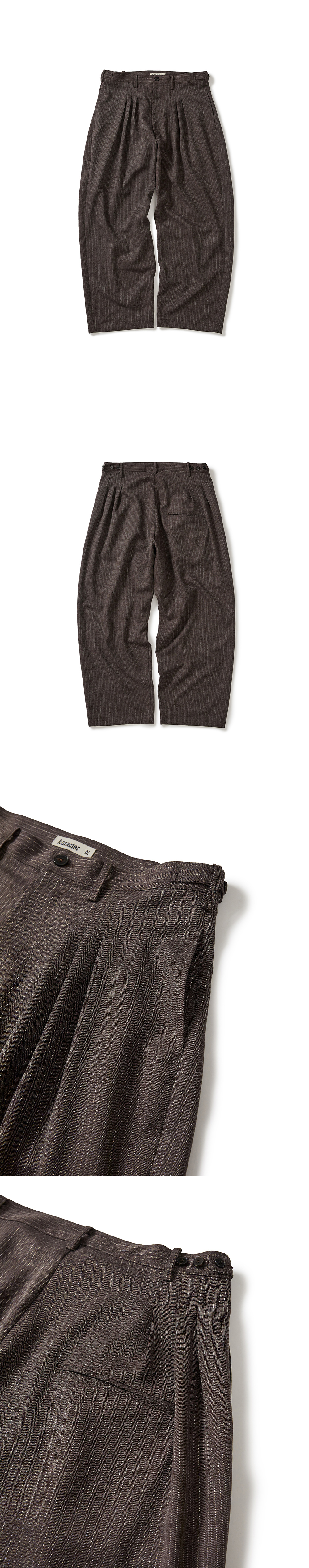 Product Info. - 유니크한 슬러브 스트라이프 패턴의 헤링본 소재 - 내추럴하게 드레이프 되는 와이드 릴랙스 핏 실루엣 - 프런트/백 사이드 트리플 턱 구조의 트라우저 - 허리 사이즈 조절 가능한 벨트라인 양 사이드 3 버튼 어드저스터 - 우측 후면 더블 웰트 포켓 디테일 - Real Cow Horn Button 사양