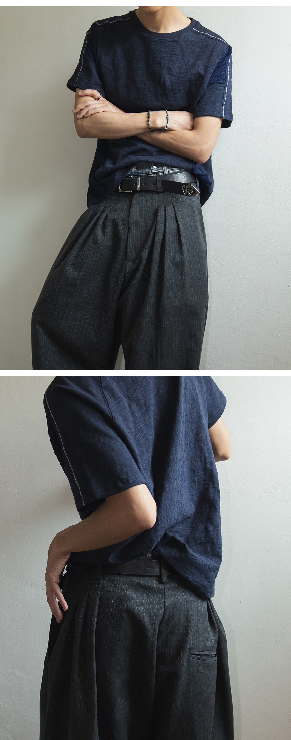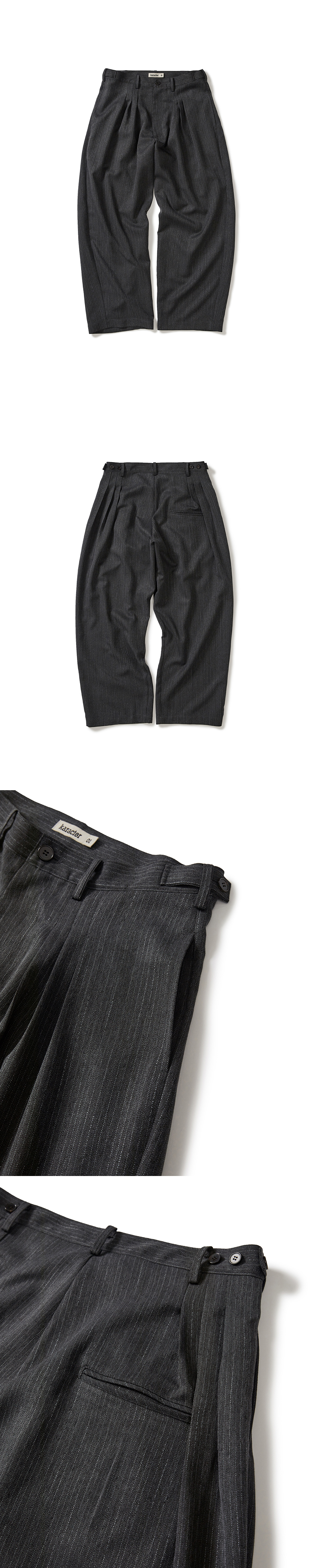 Product Info. - 유니크한 슬러브 스트라이프 패턴의 헤링본 소재 - 내추럴하게 드레이프 되는 와이드 릴랙스 핏 실루엣 - 프런트/백 사이드 트리플 턱 구조의 트라우저 - 허리 사이즈 조절 가능한 벨트라인 양 사이드 3 버튼 어드저스터 - 우측 후면 더블 웰트 포켓 디테일 - Real Cow Horn Button 사양