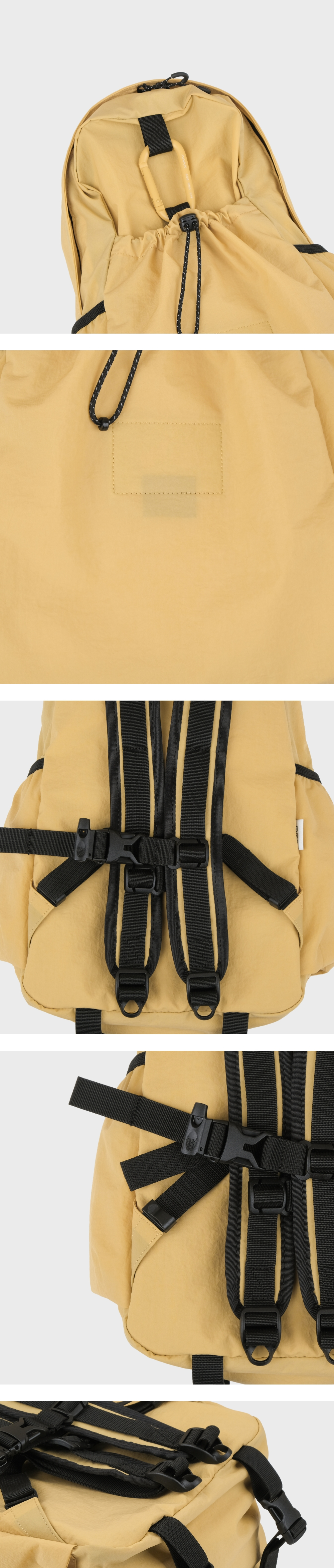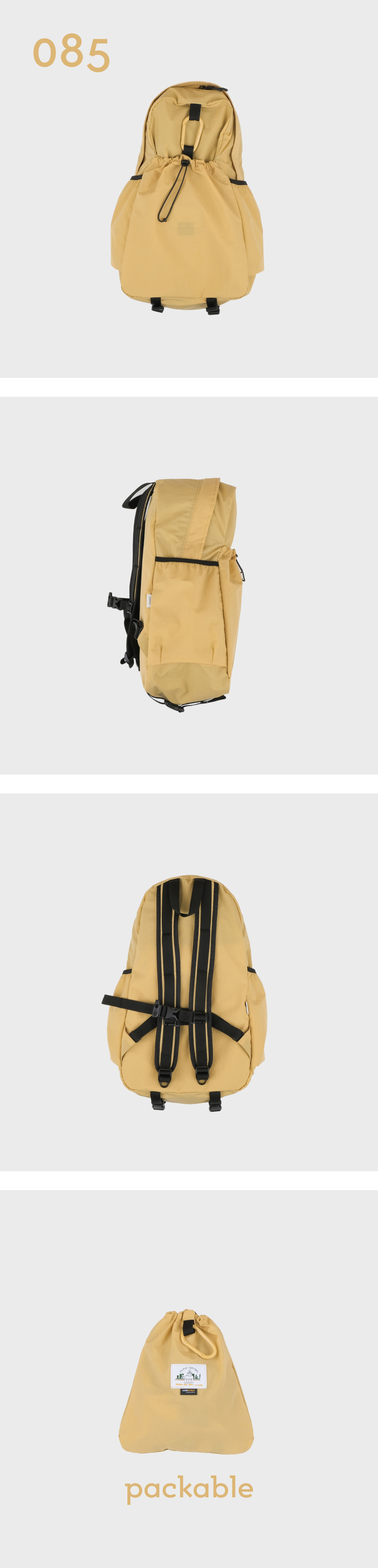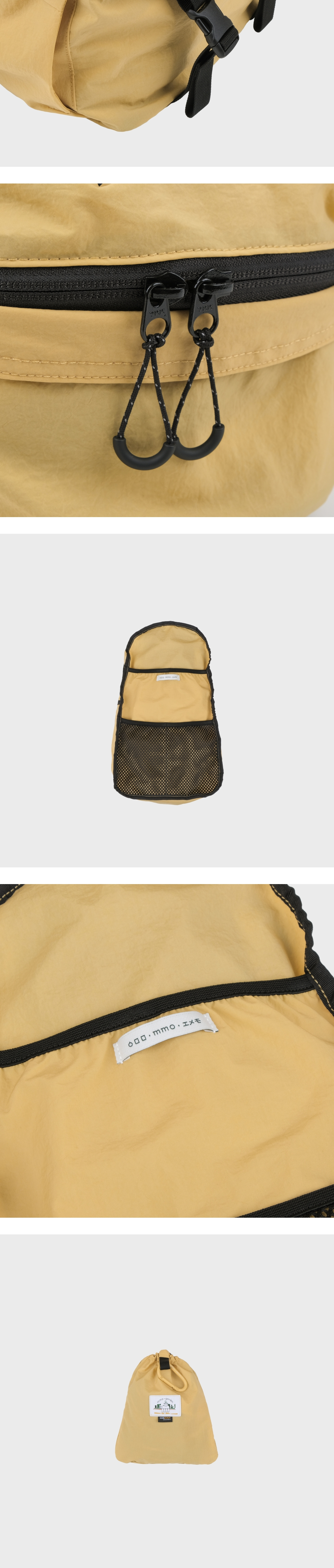 - 워싱 가공으로 내추럴하게 구겨진 텍스처와 나일론 특유의 바스락거림이 특징인 원단 - INVISTA의 CORDURA® Fabric으로 가벼우면서 견고한 것이 특징이며 생활 발수 및 방수 기능의 지속성을 위해 테프론 가공 처리 - 내부 태블릿 및 노트북 포켓과 메쉬 원단의 투 포켓, 외부 양 사이드포켓과 전면 스트링 포켓으로 구성 - 085 > 맥북 13인치 수납 가능 - 탈부착 가능한 가슴 끈에 위급한 상황시 사용할 수 있는 휘슬이 달려있습니다. - 에메모가든이 각인된 카라비너에 모자, 소품 등을 걸어 포인트를 줄 수 있습니다. - 전면 스트링 포켓으로 가방을 뒤집어 넣어 패커블이 가능하며 거북이 패치 라벨로 포인트를 주었습니다. (바깥 면에서는 사각형의 스티치 라인만 보입니다.)