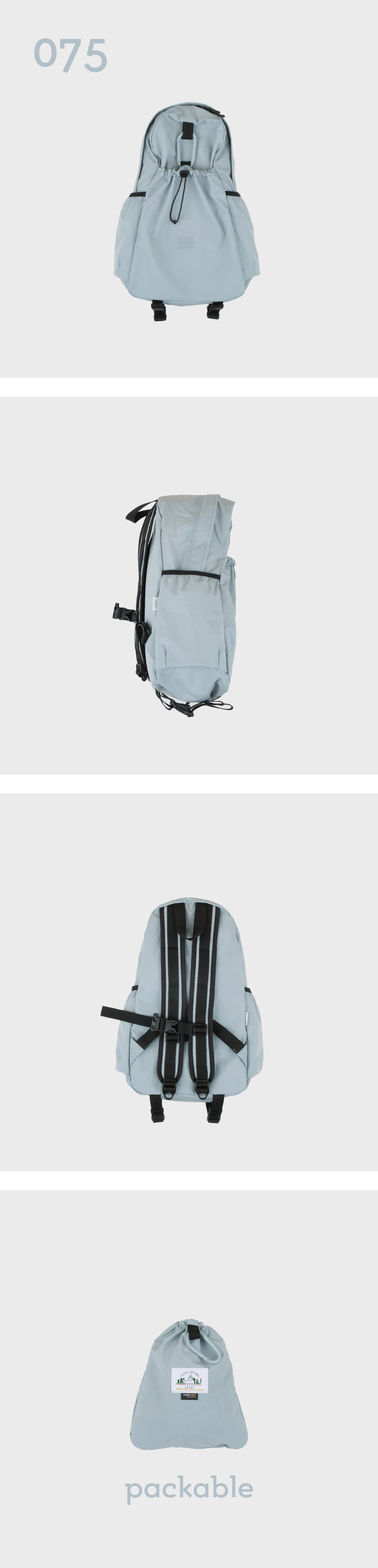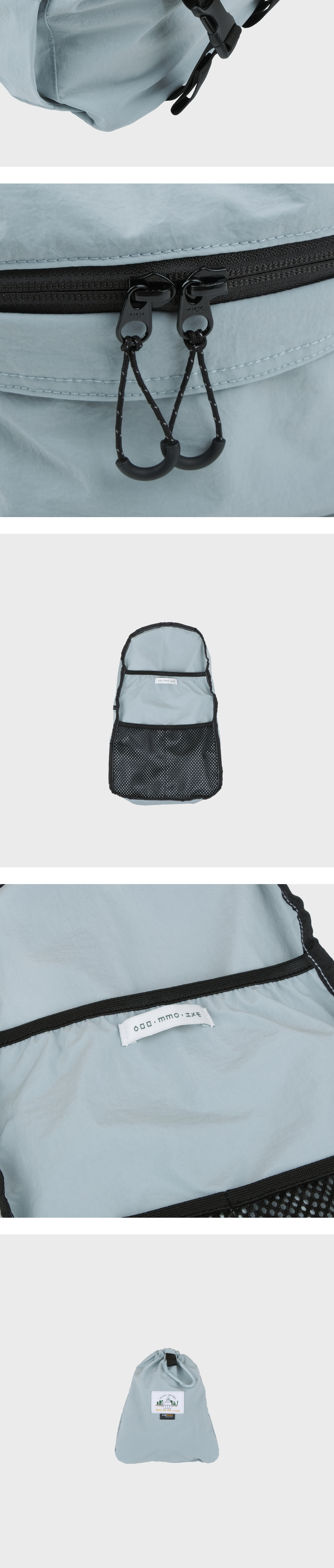 - 워싱 가공으로 내추럴하게 구겨진 텍스처와 나일론 특유의 바스락거림이 특징인 원단 - INVISTA의 CORDURA® Fabric으로 가벼우면서 견고한 것이 특징이며 생활 발수 및 방수 기능의 지속성을 위해 테프론 가공 처리 - 내부 태블릿 및 노트북 포켓과 메쉬 원단의 투 포켓, 외부 양 사이드포켓과 전면 스트링 포켓으로 구성 - 075 > 아이패드 11인치 수납 가능 - 탈부착 가능한 가슴 끈에 위급한 상황시 사용할 수 있는 휘슬이 달려있습니다. - 에메모가든이 각인된 카라비너에 모자, 소품 등을 걸어 포인트를 줄 수 있습니다. - 전면 스트링 포켓으로 가방을 뒤집어 넣어 패커블이 가능하며 거북이 패치 라벨로 포인트를 주었습니다. (바깥 면에서는 사각형의 스티치 라인만 보입니다.)