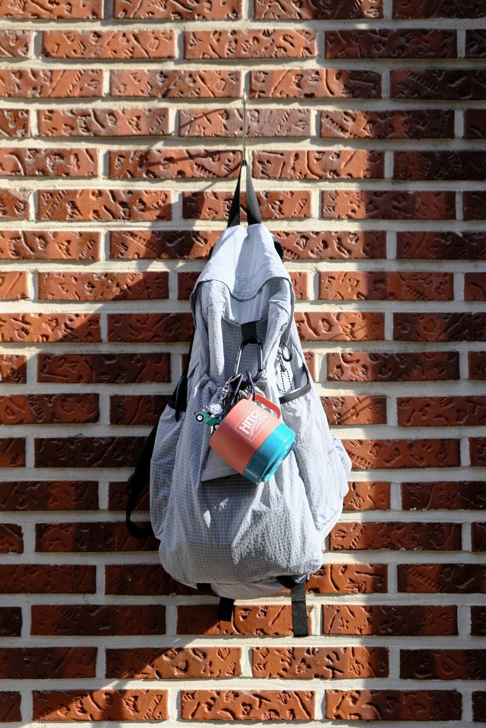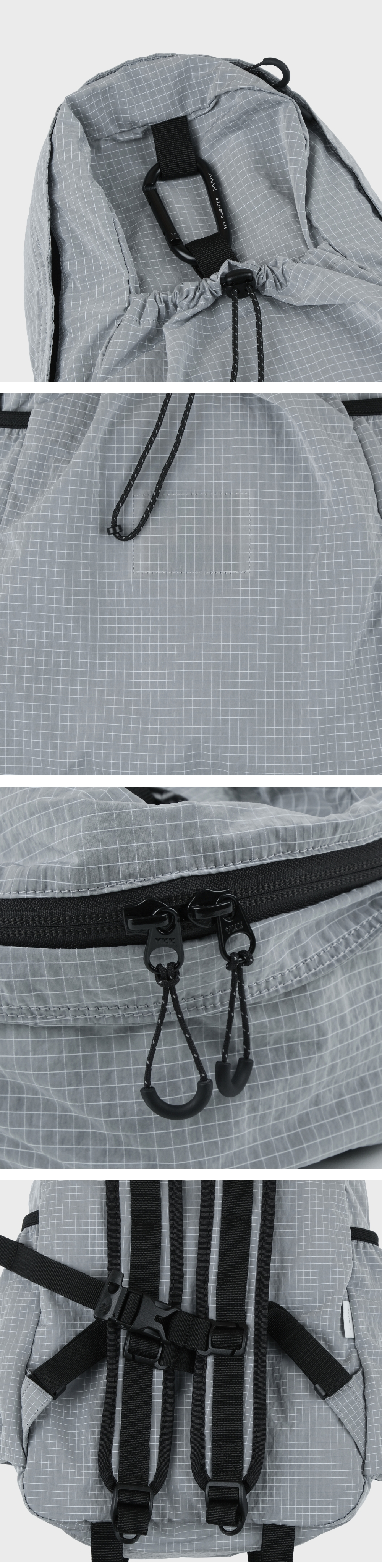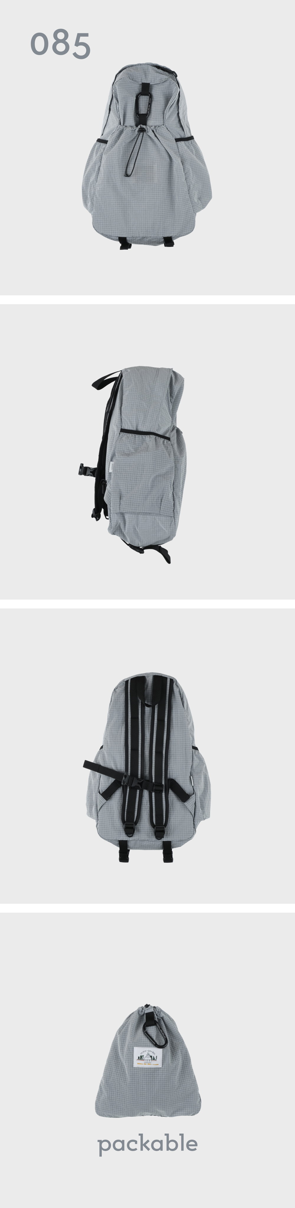 - 햇빛에 비쳐 반짝이는 잔물결 같은 텍스처의 원단 - 발수 가공 처리로 가벼운 생활방수 가능 - 바둑판 형태의 립 원단으로 메탈 실로 내구성을 높임 - 그레이에 블루 한 방울이 섞인 시멘트 컬러에 하늘색 컬러의 메탈 실이 포인트 - 내부 태블릿 및 노트북 포켓과 메쉬 원단의 투 포켓, 외부 양 사이드포켓과 전면 스트링 포켓으로 구성 - 085 > 맥북 13인치 수납 가능 - 탈부착 가능한 가슴 끈에 위급한 상황시 사용할 수 있는 휘슬이 달려있습니다. - 에메모가든이 각인된 카라비너에 모자, 소품 등을 걸어 포인트를 줄 수 있습니다. - 전면 스트링 포켓으로 가방을 뒤집어 넣어 패커블이 가능하며 거북이 패치 라벨로 포인트를 주었습니다. - (외부에서 보이는 사각봉제 부분이 립 원단 특성상 틀어져 보일 수 있습니다.)