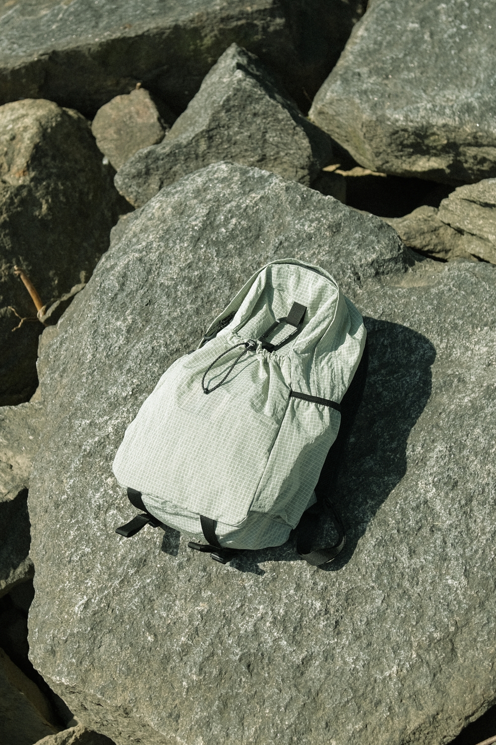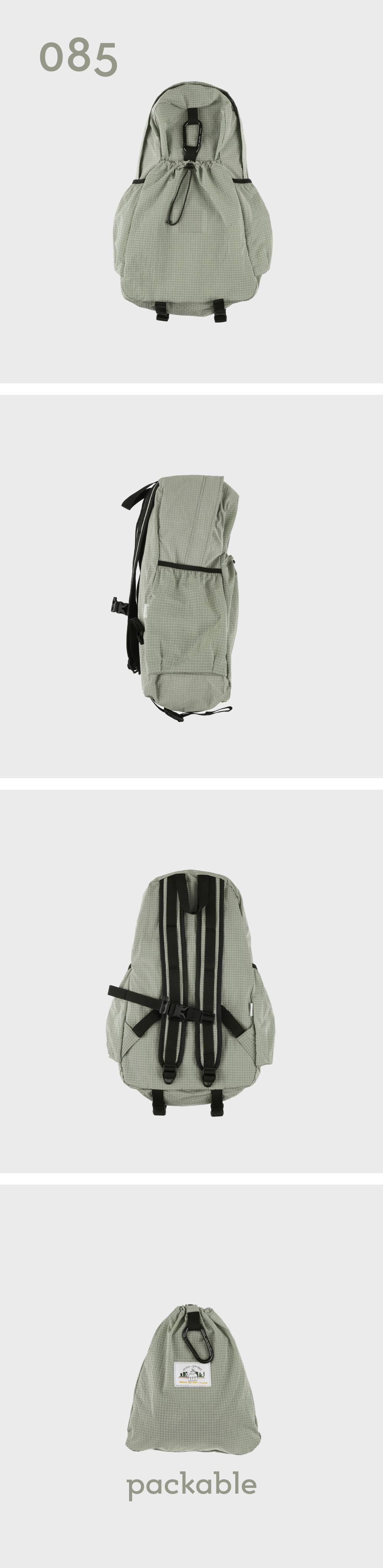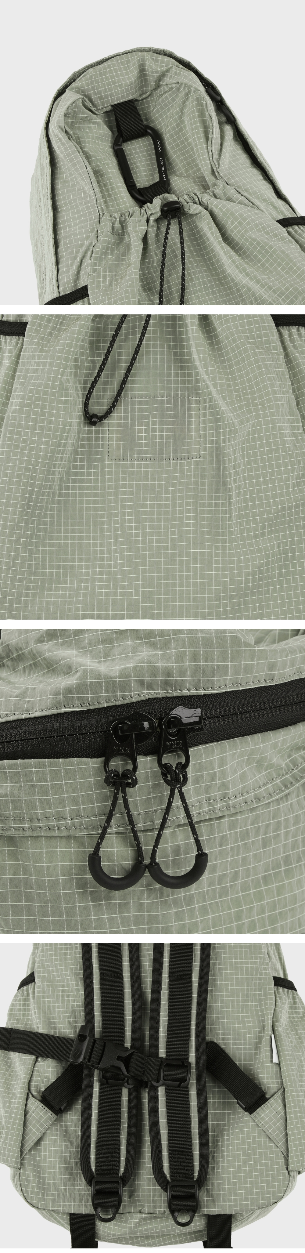 - 햇빛에 비쳐 반짝이는 잔물결 같은 텍스처의 원단 - 발수 가공 처리로 가벼운 생활방수 가능 - 바둑판 형태의 립 원단으로 메탈 실로 내구성을 높임 - 그레이 한 방울 섞인 연한 그린 색감에 라임 컬러의 메탈 실이 포인트 - 내부 태블릿 및 노트북 포켓과 메쉬 원단의 투 포켓, 외부 양 사이드포켓과 전면 스트링 포켓으로 구성 - 085 > 맥북 13인치 수납 가능 - 탈부착 가능한 가슴 끈에 위급한 상황시 사용할 수 있는 휘슬이 달려있습니다. - 에메모가든이 각인된 카라비너에 모자, 소품 등을 걸어 포인트를 줄 수 있습니다. - 전면 스트링 포켓으로 가방을 뒤집어 넣어 패커블이 가능하며 거북이 패치 라벨로 포인트를 주었습니다. - (외부에서 보이는 사각봉제 부분이 립 원단 특성상 틀어져 보일 수 있습니다.)