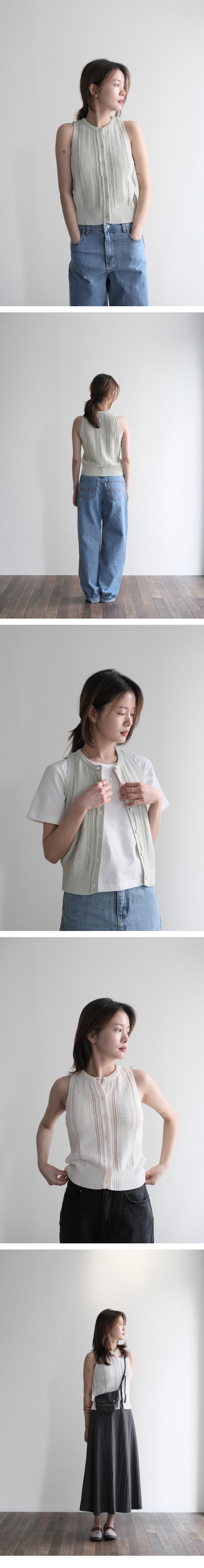 -시원한 터치감과 높은 신축성이 있는 레이온 혼방 원사 -바디라인에 핏되는 슬림한 실루엣과 홀터넥 라인의 암홀 디자인 -통기성이 좋고 레트로한 무드의 스카시 조직 -소프트한 컬러감의 민트 model : 162 / 42