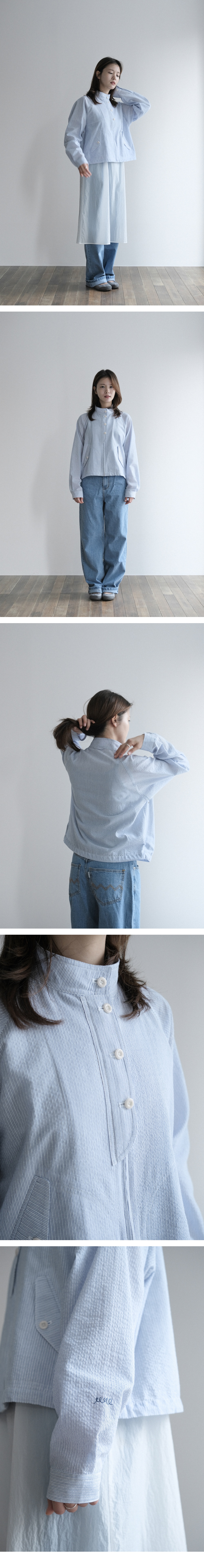 - 시어서커 원단으로 쾌적한 착용감 - 청량한 컬러감의 블루 스트라이프 - 크롭한 기장감과 플랩포켓, 짧은 플라켓 디자인 - 목까지 클로징 할 수 있는 스탠드 넥 디자인 - 넓은 사이즈 포용을 위한 래글런 패턴 - 내구성과 질감이 좋은 오리지널 너트 단추 - 통기성이 좋도록 암홀 하단 부분에 아일렛 부착 - 왼쪽 소매단에 로고 자수 포인트 - 하단 스토퍼로 스타일에 따라 다양한 핏 연출 가능 model : 162 / 42