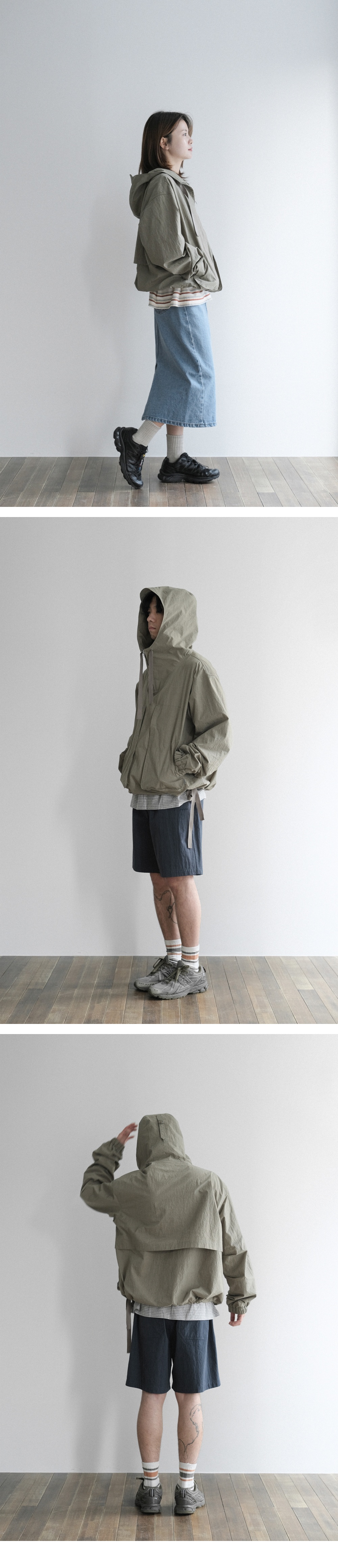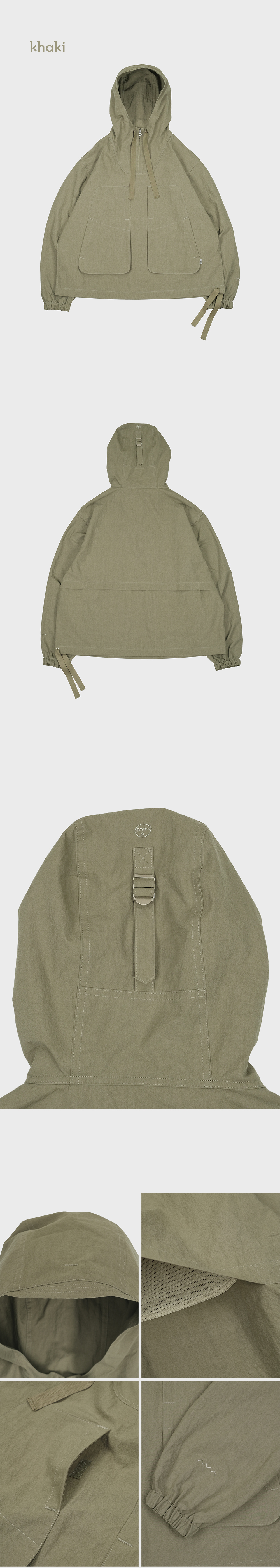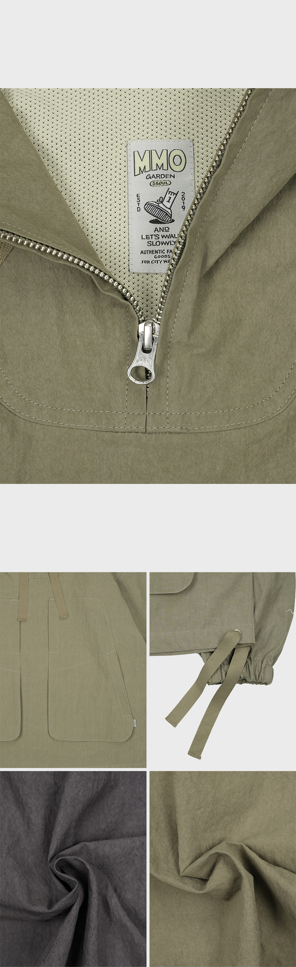 - 40수 면 나일론 혼방 원단 - 빈티지 워싱으로 내추럴한 색감과 텍스처 - 챙이 달린 후드와 모자를 쓰고 눈을 가리지 않도록 조절이 가능한 후면 버클 디테일 - 입고 벗기 편한 앞부분 지퍼 여밈 - 후면 메쉬 안감과 등 부분 트임을 통하여 쾌적한 착용 - 활동성을 고려한 소매 팔꿈치에 두 개의 턱 패턴 디자인 - 소매의 지그재그 자수와 후드 뒷부분의 mmo face 자수 포인트 - 밑단 사이드에서 끈으로 조여 다양한 핏 연출 가능 model : w 162 / 42 (top 1 size) m 176 / 65 (top 3 size) -바틱염색은 기존의 염색 방법과 다르게 원단 생지를 큰 통에 넣어 바이오 워싱과 염색을 한 번에 하는 가공 방식으로 빈티지함과 특유의 색감이 나옵니다. 염색 과정 중 생긴 접힌 자국(시와 자국)은 바틱 염색의 특징으로 불량이 아닙니다.