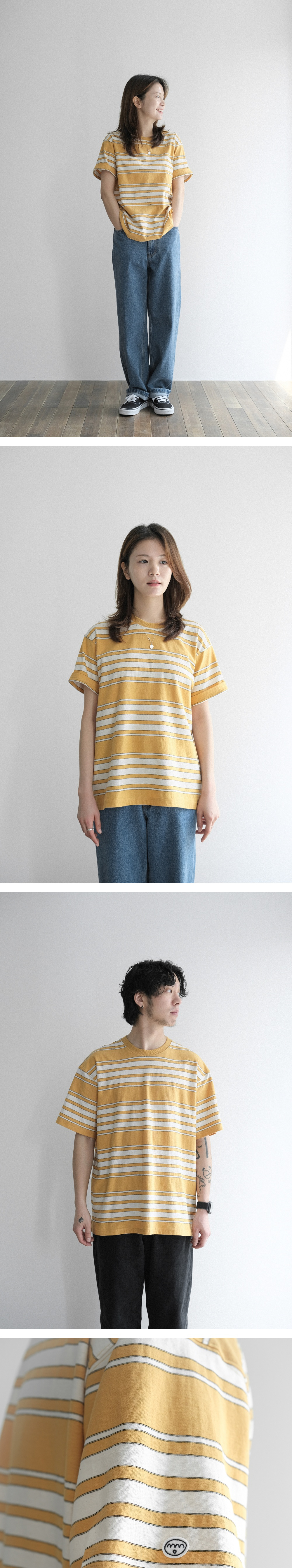 - 에메모에서 디자인하고 제작한 mvs 20수 스트라이프 원단 - 덤블 워싱, 텐타 가공으로 축률을 최소화 - 겉면의 내추럴하고 러프한 질감과 입었을 때 부드러움을 위해 원단의 뒷면을 겉으로 제작 - 적당한 기장감과 자주 손이가는 편한 착용감 - 왼쪽 소매에 mmo face 와펜 포인트 - 생지 베이스에 포인트 색감이 매력적인 티셔츠 model : w 162 / 42 (top 1 size) m 176 / 65 (top 3 size)