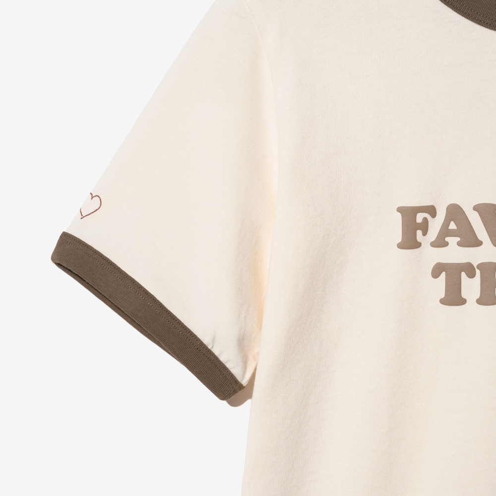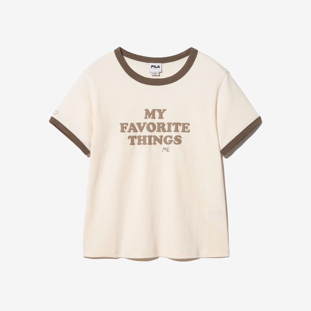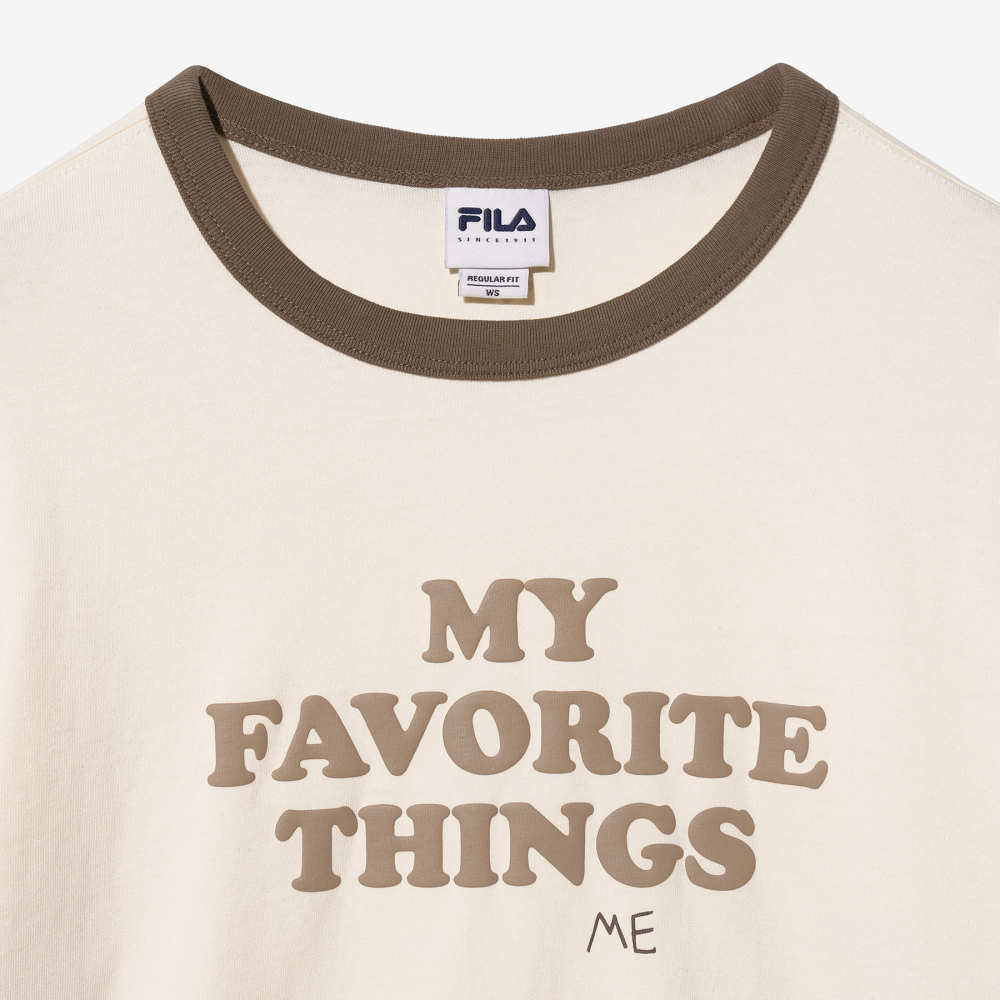 배색 포인트가 돋보이는 넥라인과 소매 디테일이 레트로한 감성을 강조해 줍니다. MY FAVORITE THINGS 레터링이 캐주얼하면서도 개성 있는 분위기를 연출합니다. 기본적인 실루엣에 감각적인 요소를 더한 아이템입니다.