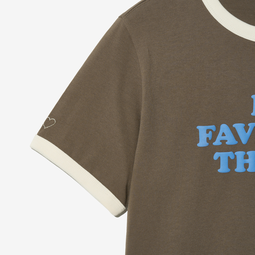 배색 포인트가 돋보이는 넥라인과 소매 디테일이 레트로한 감성을 강조해 줍니다. MY FAVORITE THINGS 레터링이 캐주얼하면서도 개성 있는 분위기를 연출합니다. 기본적인 실루엣에 감각적인 요소를 더한 아이템입니다.