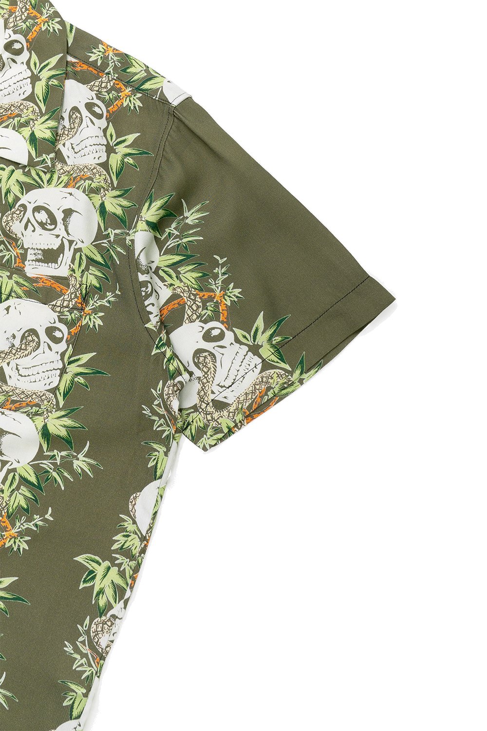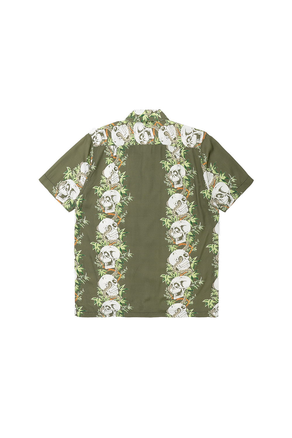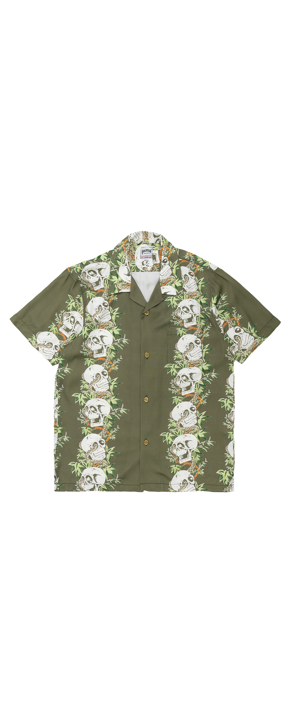 Houston Japan 41201 Aloha Shirt (骸骨) - Olive 휴스턴 재팬의 SS 시즌 스테디셀러인 알로하 셔츠입니다. 오픈칼라 타입으로 레이온 소재 특유의 부드러운 촉감이 특징입니다. 레이온의 스판 실을 사용하여 40년대의 레이온 셔츠 느낌을 재현하였고, 마디 모양이 들어간 대나무 버튼을 사용하여 오리엔탈 분위기를 맞췄습니다. 프론트 좌측 포켓에는 선글라스 등 간단한 소품들의 수납이 가능합니다. * Rayon 100% * 빛에 의한 제품의 색감 차이가 존재 할 수 있습니다. * Made in China