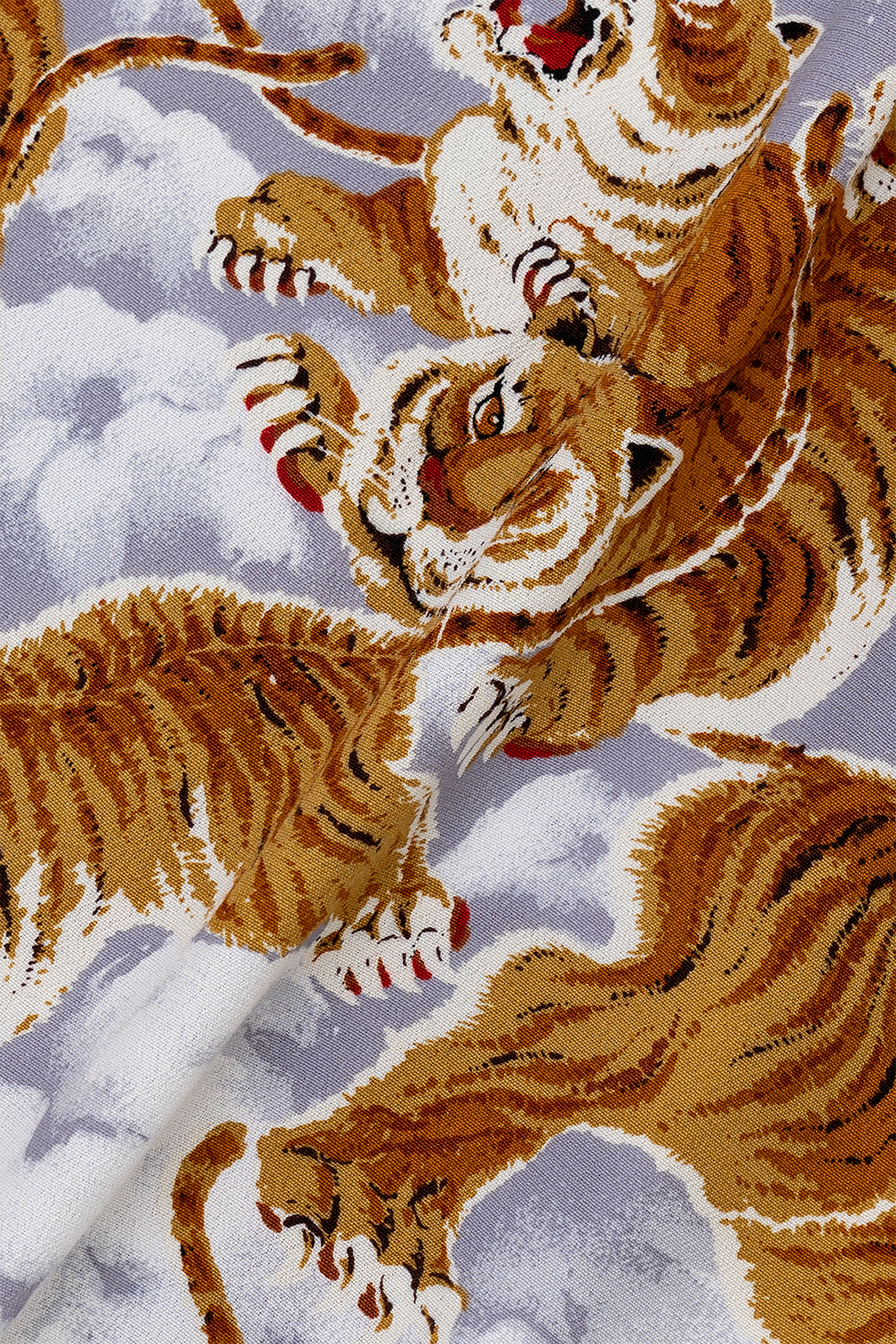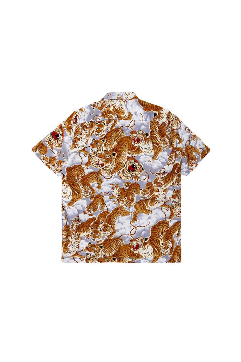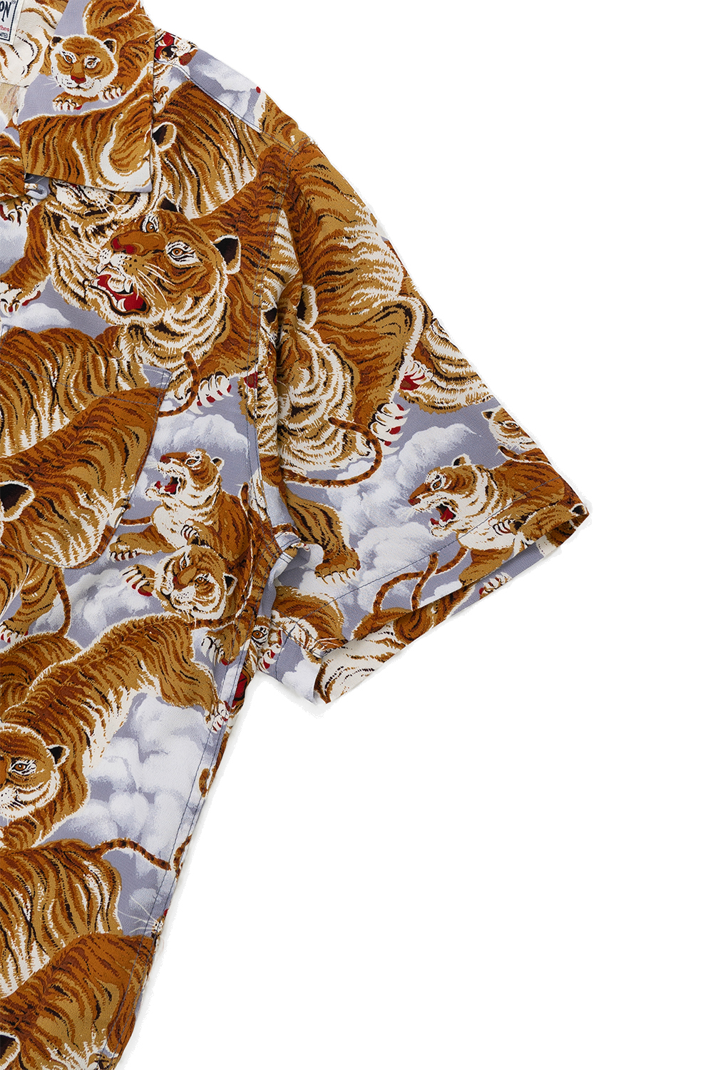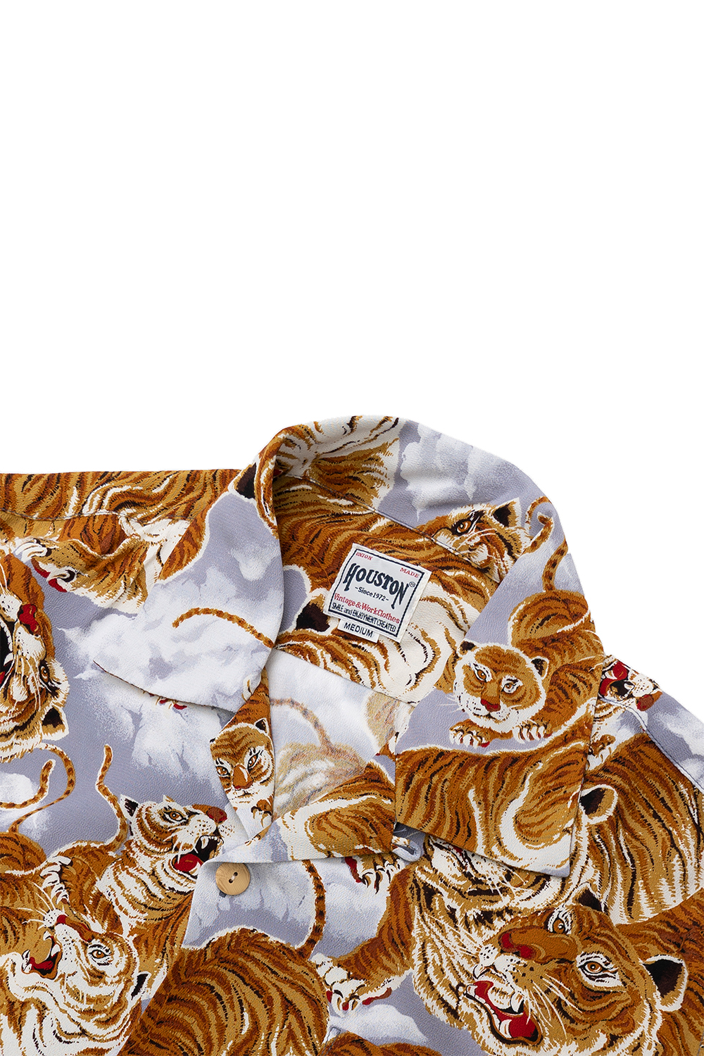 Houston Japan 41022 Aloha Shirt (百虎) - Grey 일본제 원단을 사용하여 일본 공장에서 제작한 알로하 셔츠 시리즈입니다. 대나무와 같은 마디 무늬가 들어간 우드 버튼을 사용한 것이 특지입니다. 빈티지 알로하 셔츠 중 인기가 많은 백호 무늬의 프린팅을 채용하였습니다. * Rayon 100% * 빛에 의한 제품의 색감 차이가 존재 할 수 있습니다. * Made in Japan