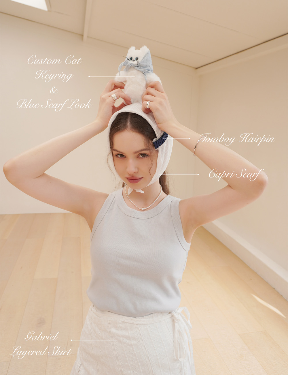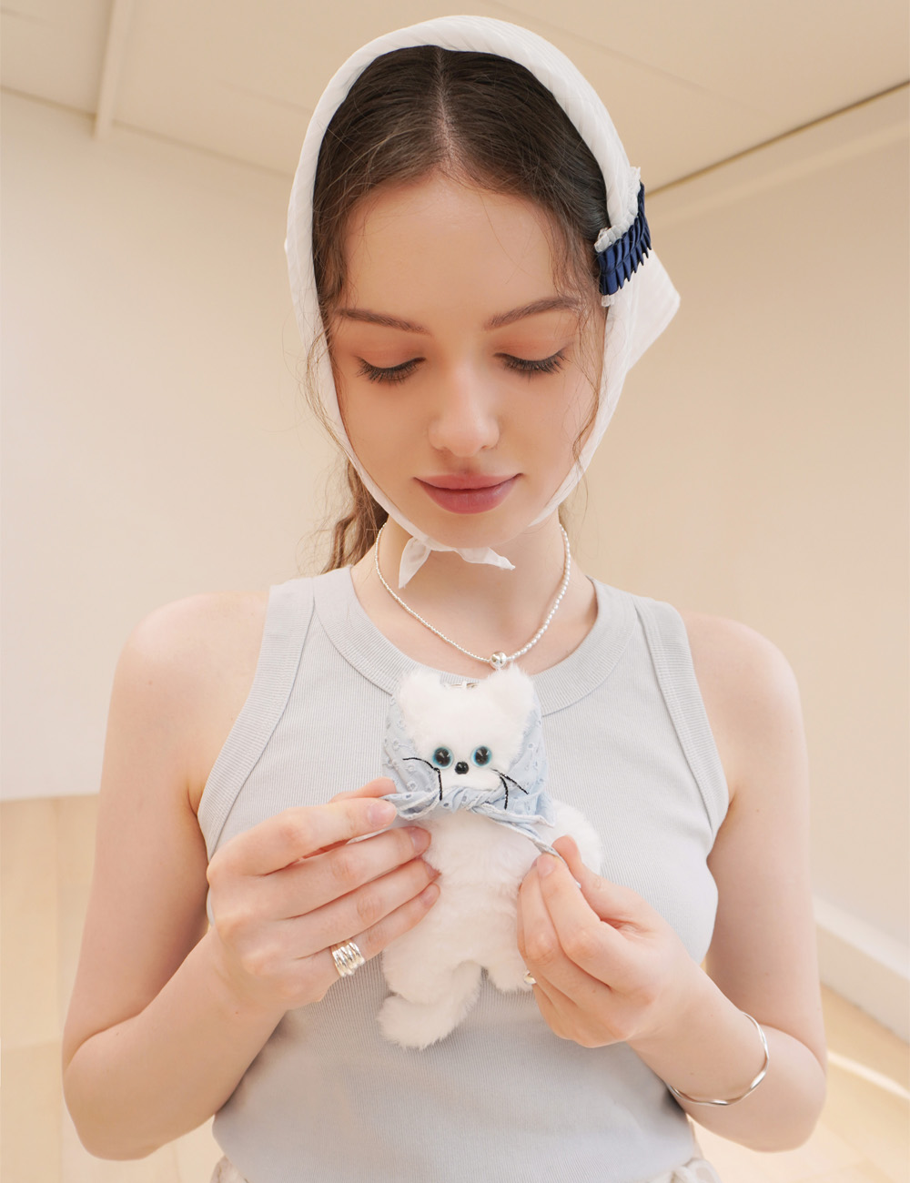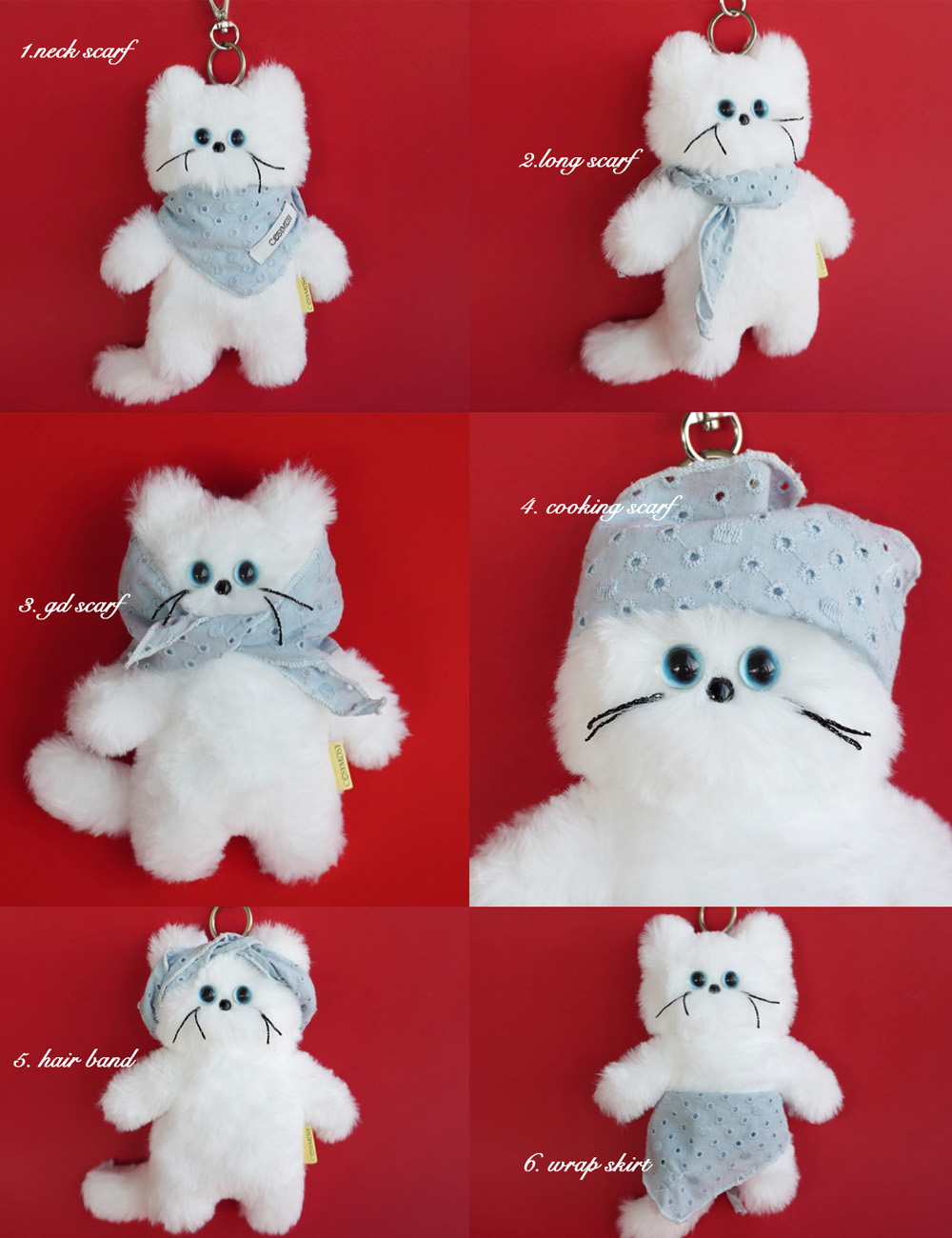 하늘색 펀칭 디테일이 사랑스러운 삼각 스카프입니다. 트렌디한 스카프 룩을 녹여낸 이번 키링 악세사리 컬렉션은 활용도가 좋은 반다나 스카프로 나만의 키링을 커스텀할 수 있습니다. 스카프는 넉넉한 길이로 제작되어 다양한 스타일링을 할 수 있으며, 탈부착이 가능하여 원하는 대로 연출 및 다른 키링과의 호환 또한 용이합니다. 약 W36 H11
