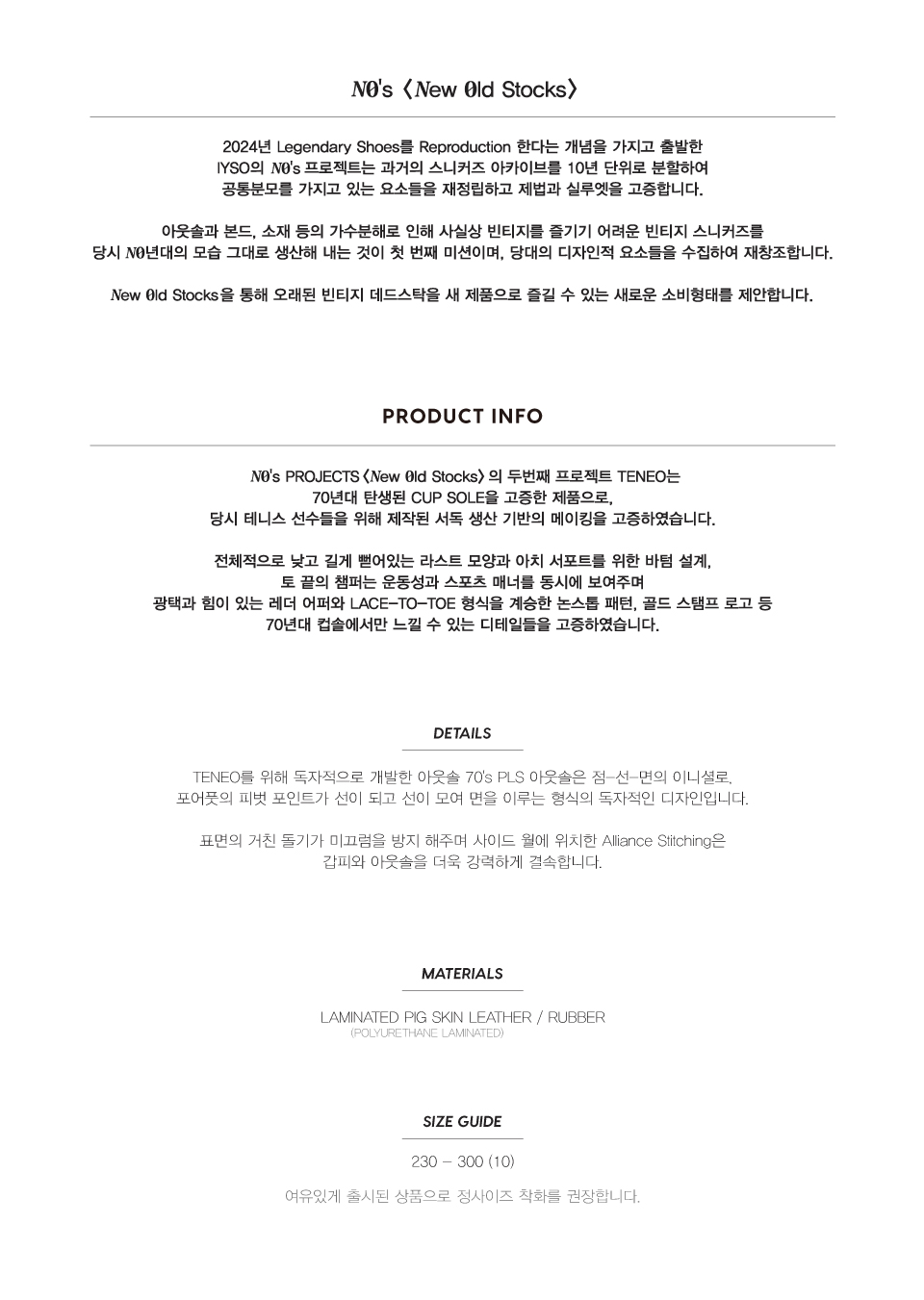 𝑵𝟎'S PROJECTS (𝑵ew 𝟎ld Stocks) 의 두번째 프로젝트 TENEO는 70년대 탄생된 CUP SOLE을 고증한 제품으로, 당시 테니스 선수들을 위해 제작된 서독 생산 기반의 메이킹을 고증하였습니다. 전체적으로 낮고 길게 뻗어있는 라스트 모양과 아치 서포트를 위한 바텀 설계, 토 끝의 챔퍼는 운동성과 스포츠매너를 동시에 보여주며 광택과 힘이 있는 레더 어퍼와 LACE-TO-TOE 형식을 계승한 논스톱 패턴, 골드 스탬프 로고 등 70년대 컵솔에서만 느낄 수 있는 디테일들을 고증하였습니다. TENEO를 위해 독자적으로 개발한 아웃솔 70'S PLS 아웃솔은 점-선-면의 이니셜로, 포어풋의 피벗 포인트가 선이 되고 선이 모여 면을 이루는 형식의 독자적인 디자인입니다. 표면의 거친 돌기가 미끄럼을 방지 해주며 사이드 월에 위치한 Alliance Stitching은 갑피와 아웃솔을 더욱 강력하게 결속합니다.