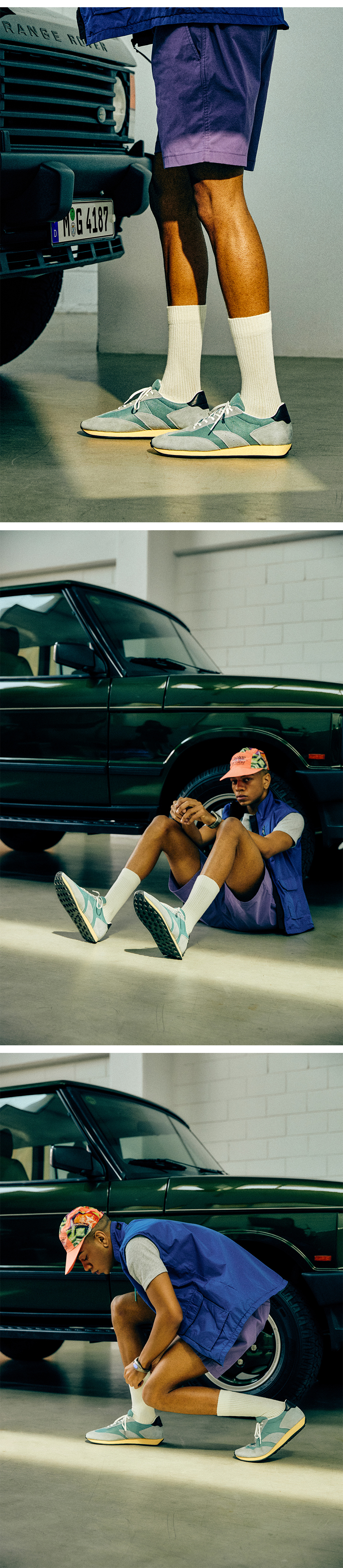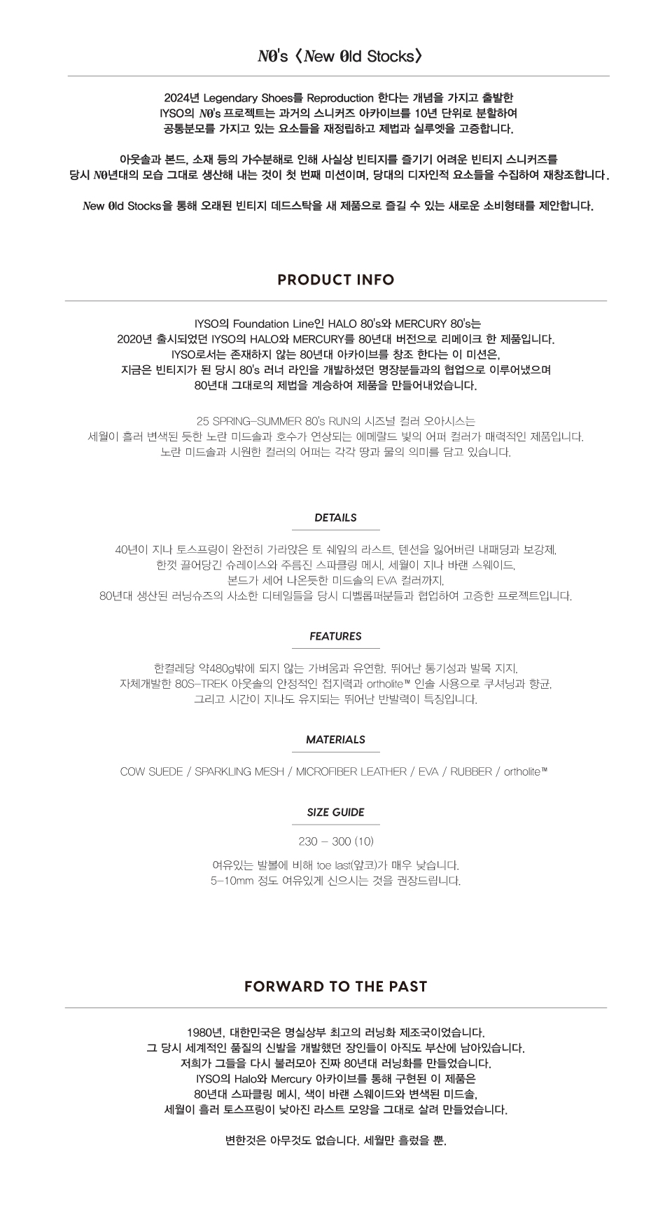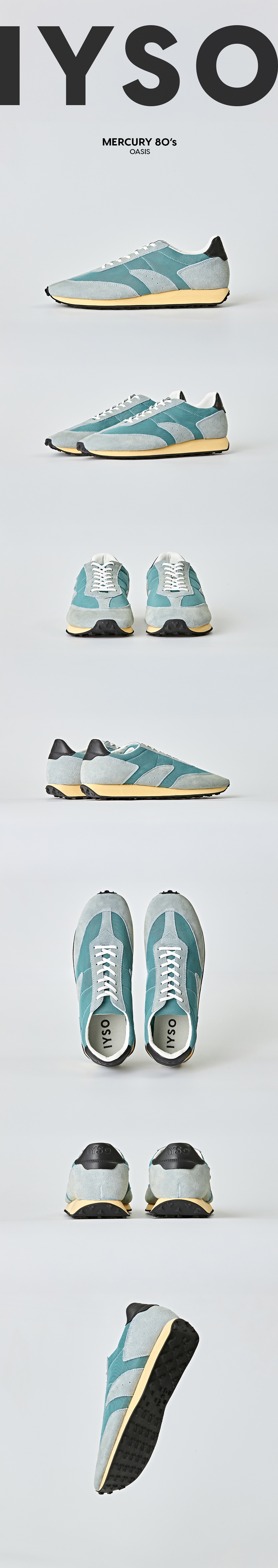 25 SPRING-SUMMER 80'S RUN의 시즈널 컬러 오아시스는 세월이 흘러 변색된 듯한 노란 미드솔과 호수가 연상되는 에메랄드 빛의 어퍼 컬러가 매력적인 제품입니다. 노란 미드솔과 시원한 컬러의 어퍼는 각각 땅과 물의 의미를 담고 있습니다.
