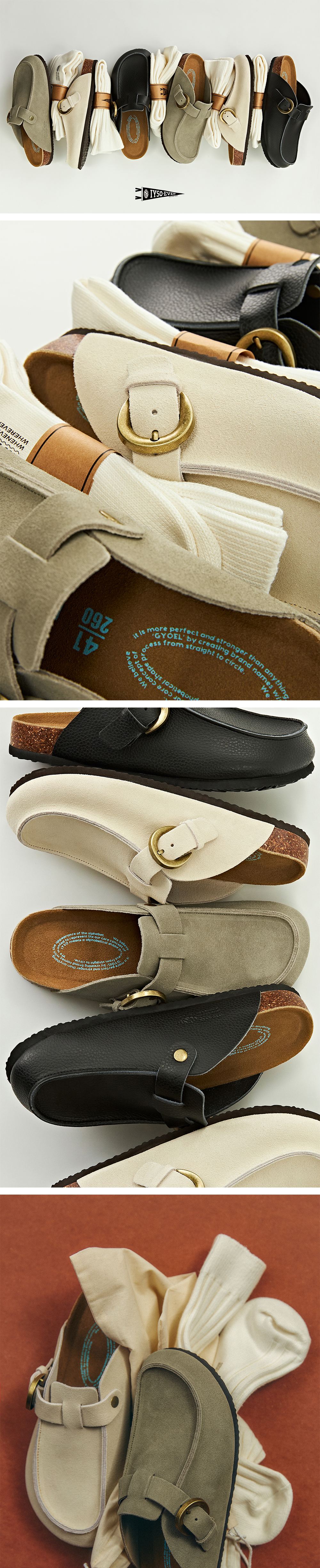 IYSO-EVER는 Essential footwear로 합리적인 가격으로 누구나 언제 어디서든 즐길 수 있는 풋웨어를 지향합니다. UTE는 코르크 미드솔과 EVA 아웃솔, 부드러운 스웨이드 풋베드 베이스의 뮬타입 제품으로 아웃 스티칭된 U-TOE 뱀프 라인과 웨스턴 무드의 버클이 특징이며 TAUPE / CREMA / BLACK 3가지 컬러가 출시됩니다. 사용자의 목적에 따라 실외 혹은 실내에서도 착용할 수 있으며 크림 컬러의 면 폴리 8:2 혼방의 Heavy Duty Socks와 더스트백이 포함됩니다.