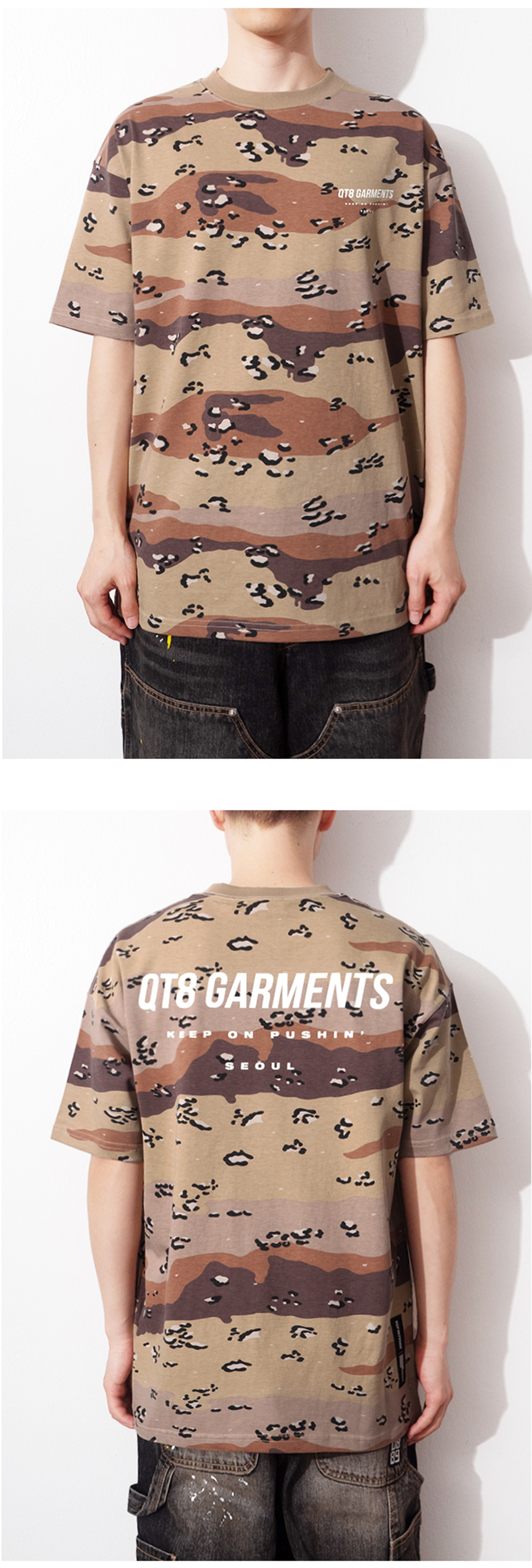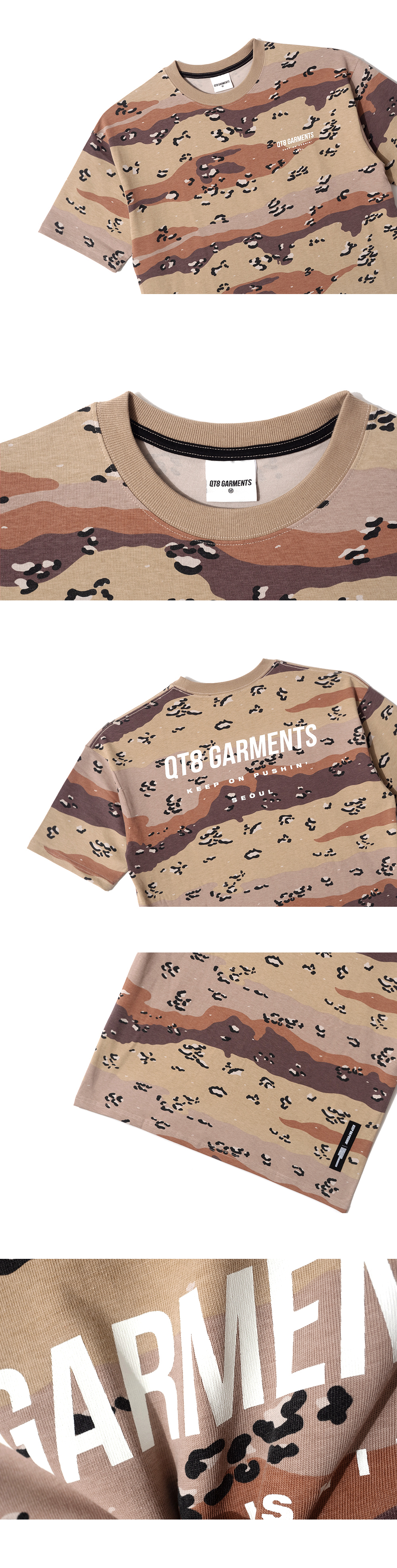 큐티에잇 가먼츠 심플 로고 초콜릿 칩 카모 티 베이지