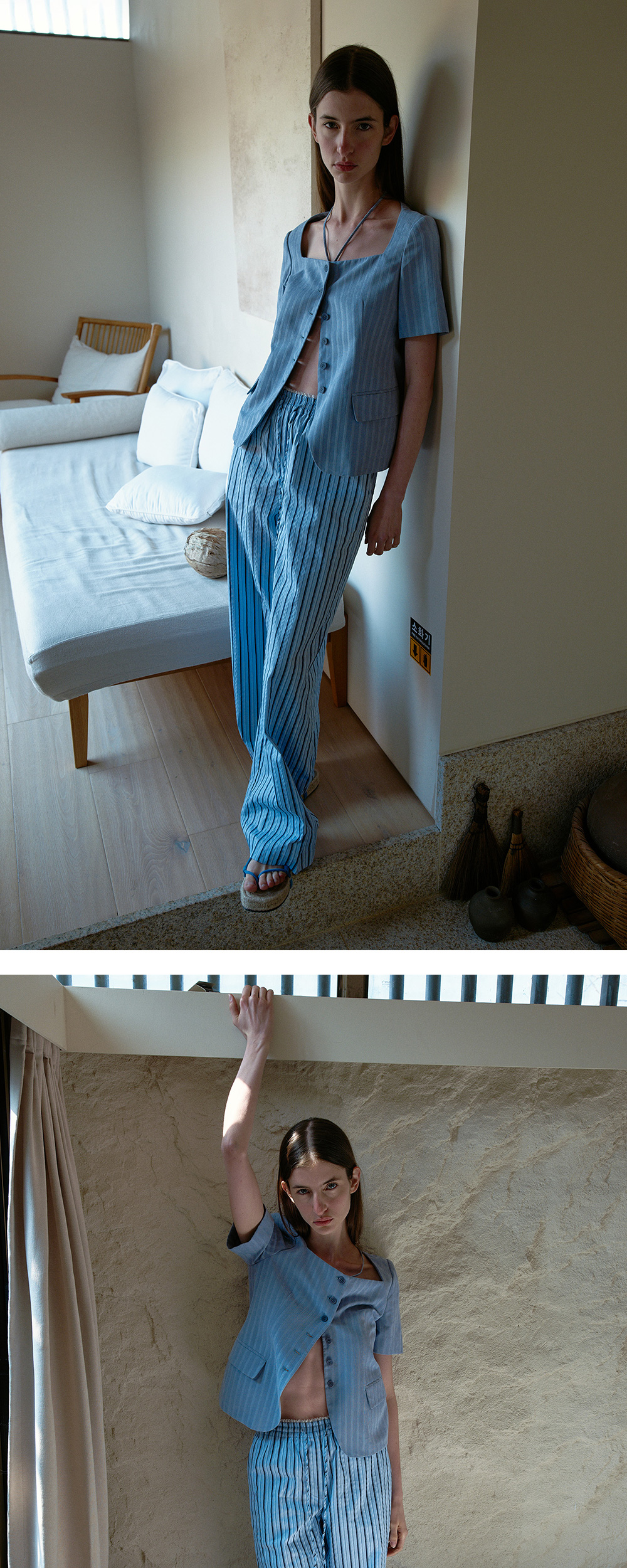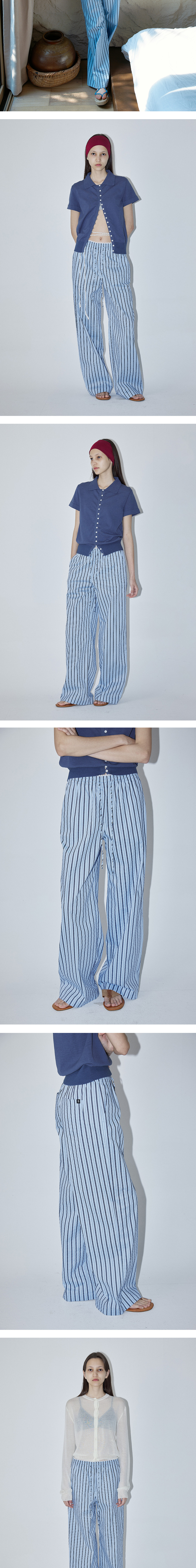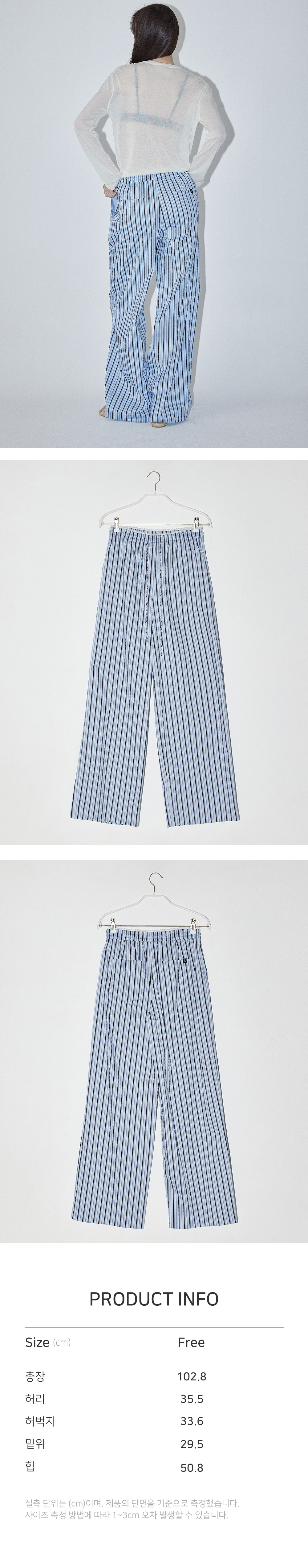 - 신축성 있는 배색 레이스 밴드를 허리단에 더해 은은한 페미닌 무드를 살린 와이드 핏 팬츠입니다. - 은은한 시어서커 소재로 제작된 스트라이프 팬츠로 시원하고 가벼운 착용감을 선사해 쾌적하게 입을 수 있는 아이템입니다. - 허리 밴드와 스트링 디테일로 편안한 착용이 가능합니다. - 구김이 적어 다림질 없이도 관리가 용이합니다. - 옆주머니와 뒷주머니가 있어 실용성을 더했습니다. - 뒷주머니에 엔오르 심볼 직조 라벨을 더해 감각적인 포인트를 완성했습니다.