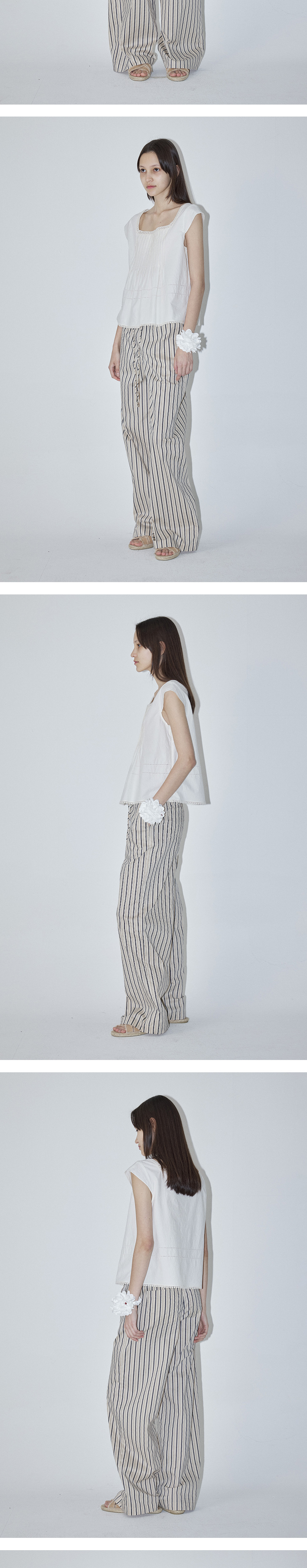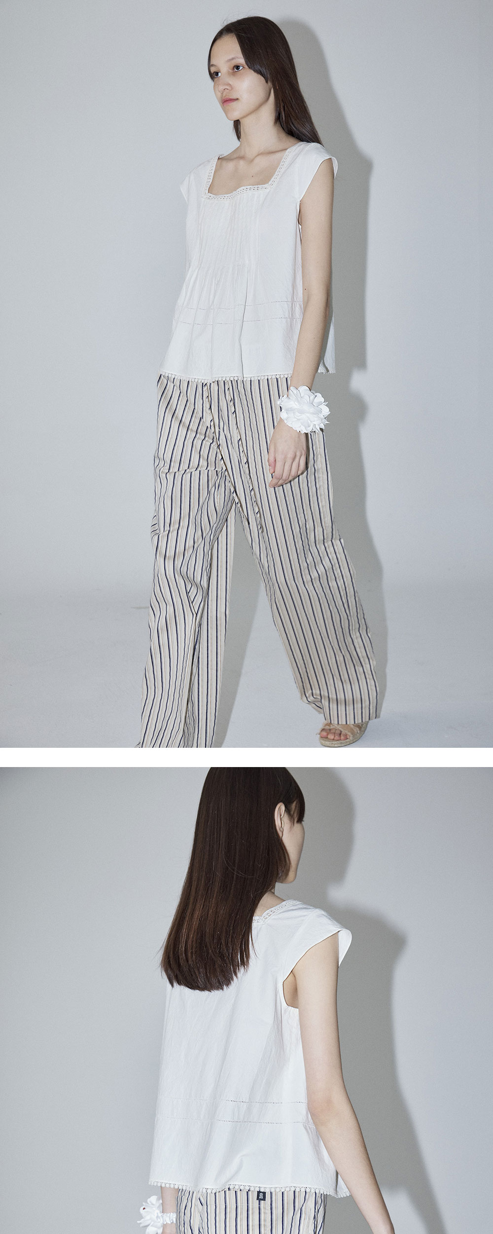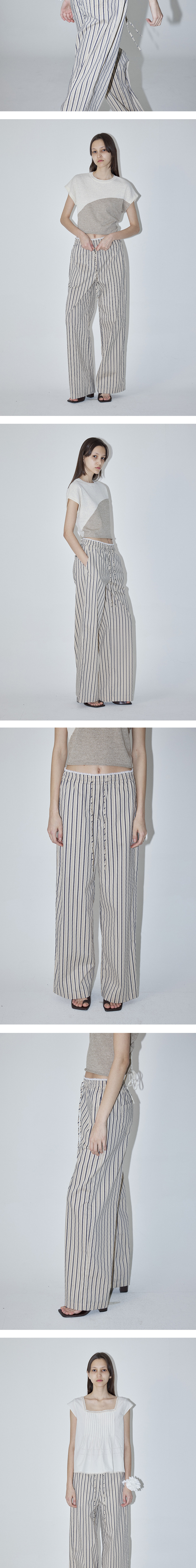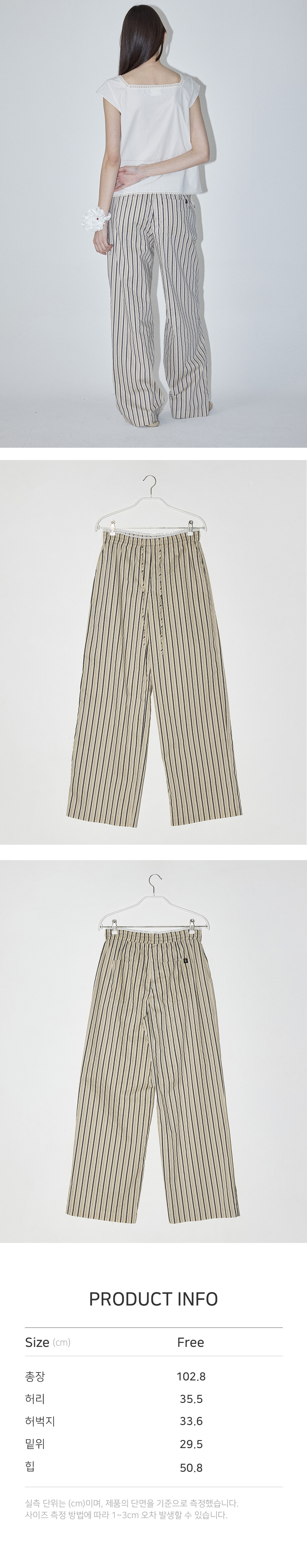 - 신축성 있는 배색 레이스 밴드를 허리단에 더해 은은한 페미닌 무드를 살린 와이드 핏 팬츠입니다. - 은은한 시어서커 소재로 제작된 스트라이프 팬츠로 시원하고 가벼운 착용감을 선사해 쾌적하게 입을 수 있는 아이템입니다. - 허리 밴드와 스트링 디테일로 편안한 착용이 가능합니다. - 구김이 적어 다림질 없이도 관리가 용이합니다. - 옆주머니와 뒷주머니가 있어 실용성을 더했습니다. - 뒷주머니에 엔오르 심볼 직조 라벨을 더해 감각적인 포인트를 완성했습니다.