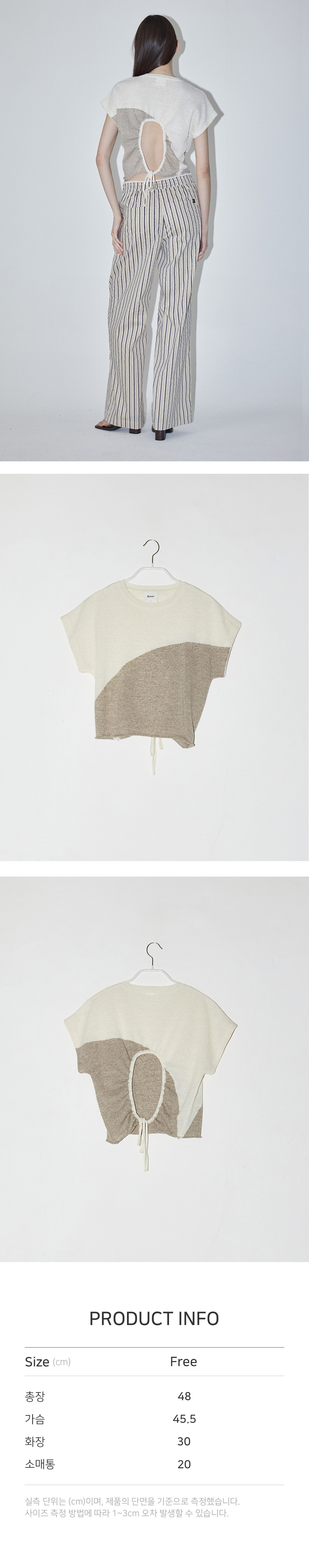 - 크롭한 기장감과 투톤 배색 라인 디테일로 스타일리시하면서도 트렌디한 무드를 연출하는 니트 탑입니다. - 뒷면의 원형 스트링 디테일이 조절 가능하며 자연스러운 셔링이 매력적인 제품입니다. - 스트링을 조절함으로써 다양한 실루엣 연출이 가능합니다. - 밑단에 말림단 디테일로 포인트를 주어, 더욱 입체적이고 세련된 느낌을 선사합니다. - 린넨 혼방 원사로 제작되어 여름철에도 가볍고 시원하게 착용이 가능합니다.