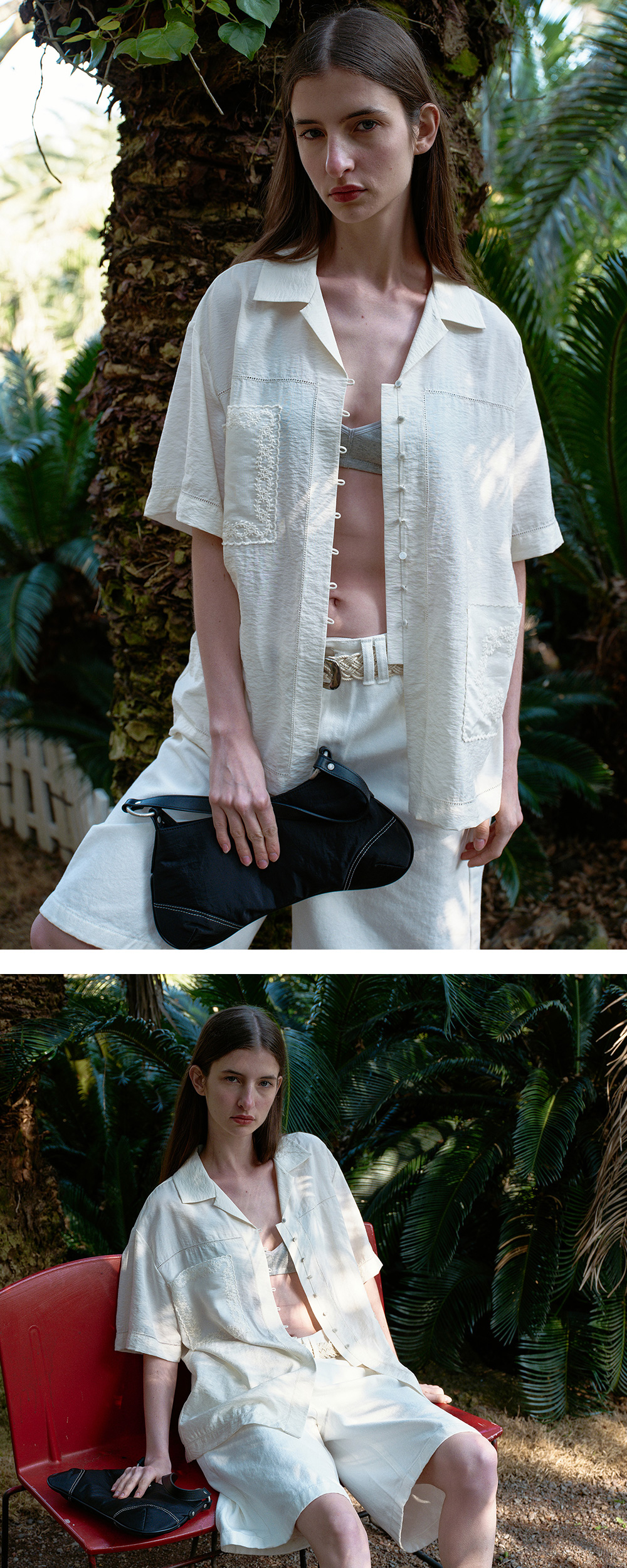 - 여유로운 오버핏 실루엣으로 편안하면서도 트렌디한 무드를 연출할 수 있는 하프 슬리브 셔츠입니다. - 몸판과 소매 전체에 들어간 패고딩 자수 디테일이 은은한 입체감을 더해주며, 포켓 위 자수 패치 디테일로 포인트를 더했습니다. - 레이온과 나일론 혼방 소재로 제작되어 가볍고 시원한 착용감은 물론, 여름 시즌에도 쾌적하게 착용 가능한 아이템입니다.