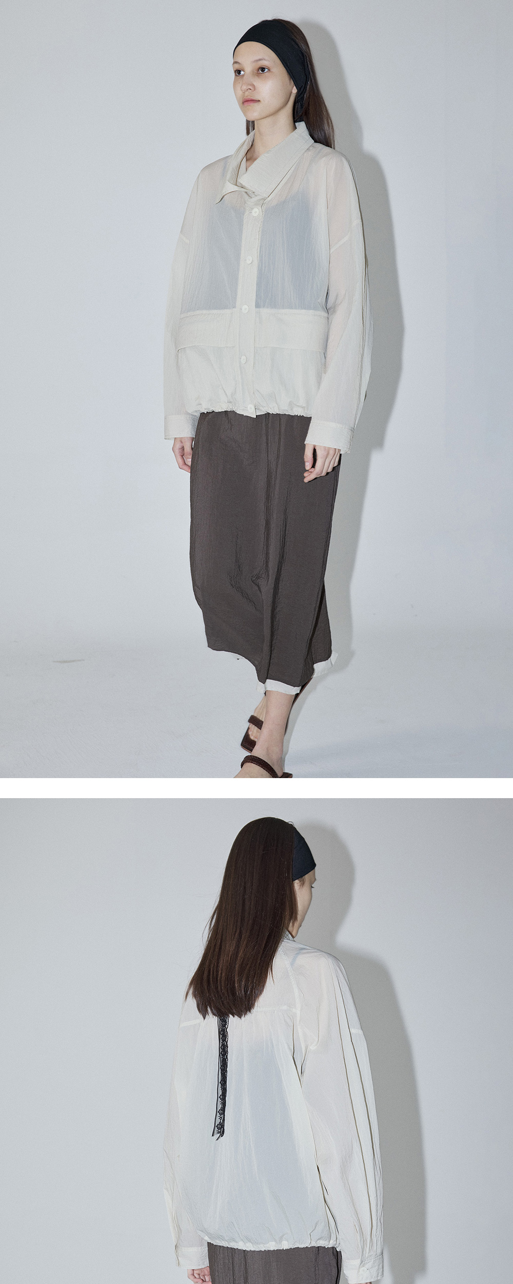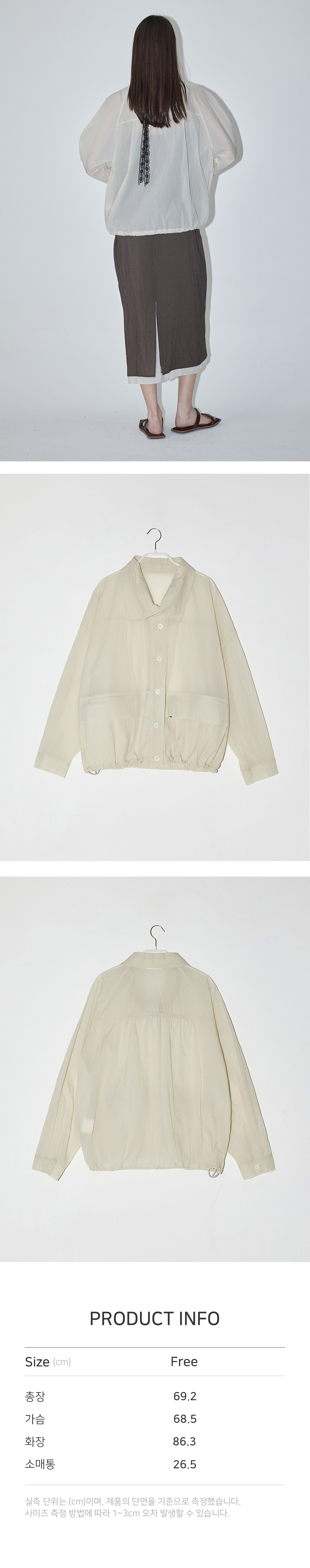 - 하이넥과 턱 디테일이 어우러져 전체적으로 은은한 페미닌 무드를 연출해주는 점퍼입니다. - 앞단작에는 단추 여밈, 밑단에는 스트링 디테일이 더해져 실루엣을 자유롭게 조절할 수 있으며, 셔츠형 소매 디자인으로 한층 더 높은 완성도를 자랑합니다. - 뒷요크 아래 잔잔한 셔링 디테일이 페미닌 무드를 연출합니다. - 실사용 가능한 포켓을 더해 스타일뿐만 아니라 실용성도 놓치지 않은 아이템입니다. - 사각거리는 텍스처의 워셔 나일론 원단으로, 가볍고 쾌적하게 착용 가능하며 은은하게 비치는 쉬어한 질감이 매력적인 점퍼입니다.