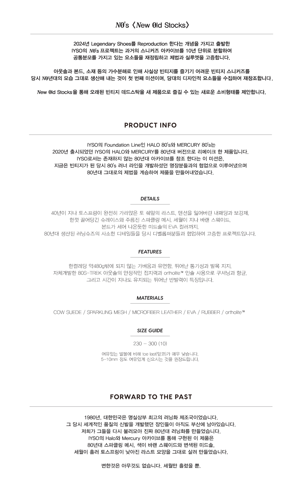 IYSO의 Foundation Line으로 선보이는 될 MERCURY 80's는 2020년 출시되었던 MERCURY를 80년대 버전으로 리메이크 한 제품입니다. IYSO로서는 존재하지 않는 80년대 아카이브를 창조 한다는 이 미션은 지금은 빈티지가 된, 당시 80S 러너라인을 개발하셨던 명장분들과의 협업으로 이루어냈으며 80년대 그대로의 제법을 계승하여 제품을 만들어내었습니다. 40년이 지나 토스프링이 완전히 가라앉은 토쉐잎의 라스트, 텐션을 잃어버린 내패딩과 보강제, 한껏 끌어당긴 슈레이스와 주름진 스파클링 메시, 세월이 지나 바랜 스웨이드, 본드가 세어나온듯한 미드솔의 EVA 컬러까지 사소한 모든 디테일을 생산성 있게 구현해내었고 마침내 모습을 드러내게 되었습니다.