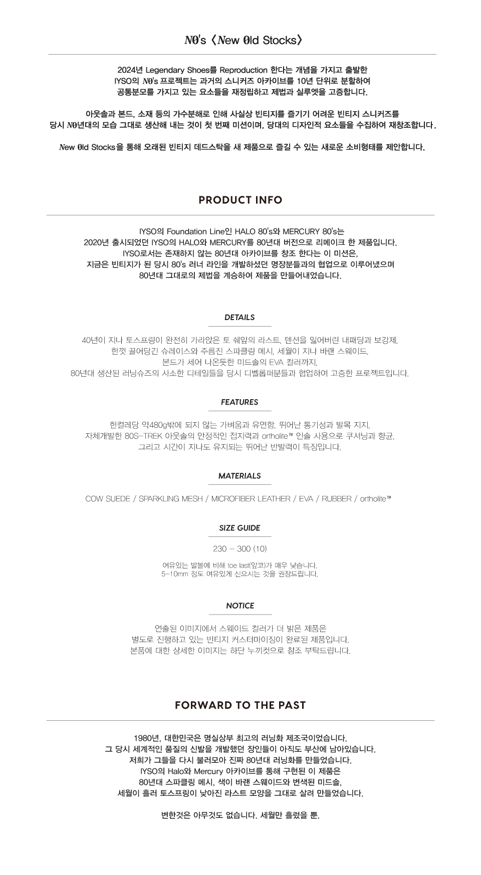 IYSO의 Foundation Line으로 선보이는 될 MERCURY 80's는 2020년 출시되었던 MERCURY를 80년대 버전으로 리메이크 한 제품입니다. IYSO로서는 존재하지 않는 80년대 아카이브를 창조 한다는 이 미션은 지금은 빈티지가 된, 당시 80S 러너라인을 개발하셨던 명장분들과의 협업으로 이루어냈으며 80년대 그대로의 제법을 계승하여 제품을 만들어내었습니다. 40년이 지나 토스프링이 완전히 가라앉은 토쉐잎의 라스트, 텐션을 잃어버린 내패딩과 보강제, 한껏 끌어당긴 슈레이스와 주름진 스파클링 메시, 세월이 지나 바랜 스웨이드, 본드가 세어나온듯한 미드솔의 EVA 컬러까지 사소한 모든 디테일을 생산성 있게 구현해내었고 마침내 모습을 드러내게 되었습니다.