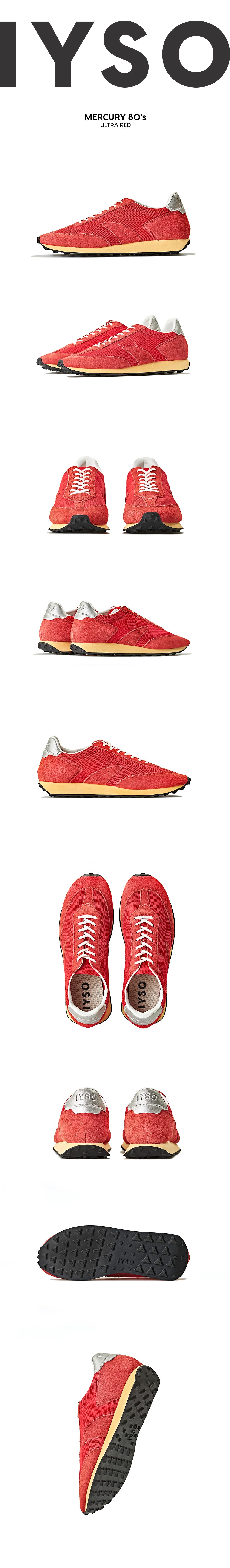 IYSO의 Foundation Line으로 선보이는 될 MERCURY 80's는 2020년 출시되었던 MERCURY를 80년대 버전으로 리메이크 한 제품입니다. IYSO로서는 존재하지 않는 80년대 아카이브를 창조 한다는 이 미션은 지금은 빈티지가 된, 당시 80S 러너라인을 개발하셨던 명장분들과의 협업으로 이루어냈으며 80년대 그대로의 제법을 계승하여 제품을 만들어내었습니다. 40년이 지나 토스프링이 완전히 가라앉은 토쉐잎의 라스트, 텐션을 잃어버린 내패딩과 보강제, 한껏 끌어당긴 슈레이스와 주름진 스파클링 메시, 세월이 지나 바랜 스웨이드, 본드가 세어나온듯한 미드솔의 EVA 컬러까지 사소한 모든 디테일을 생산성 있게 구현해내었고 마침내 모습을 드러내게 되었습니다.