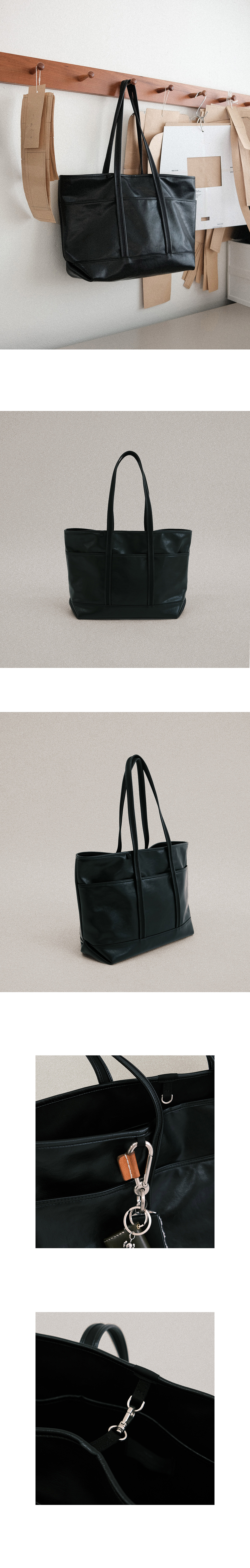 자연스러운 크랙과 소프트한 텍스쳐의 Synthetic Leather로 만든 올블랙 토트백입니다. 고정되지 않은 스트랩은 블랭킷이나 셔츠 등 긴 물품 수납에 유용해 여행용으로도 적합합니다. 넉넉한 수납력을 갖춘 유니섹스 디자인으로 데일리백으로도 활용도가 높습니다. w 490x h 290x d 160 mm / strap 640 (± 30)/ 750g - 자연스러운 크랙과 소프트한 텍스쳐의 Synthetic Leather - 바이어스로 포인트를 준 스트랩 디테일 - 키링 고리와 숄더스트랩 - 외부 포켓3 내부포켓3 - 금속 부자재 잠금