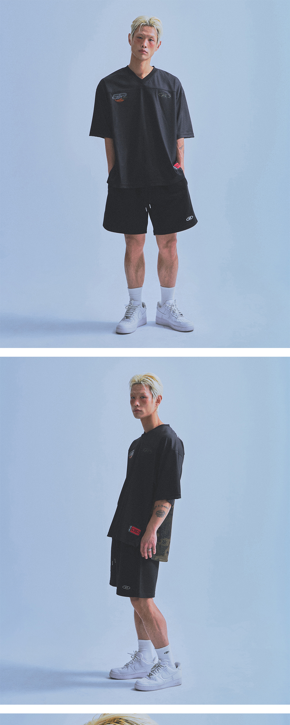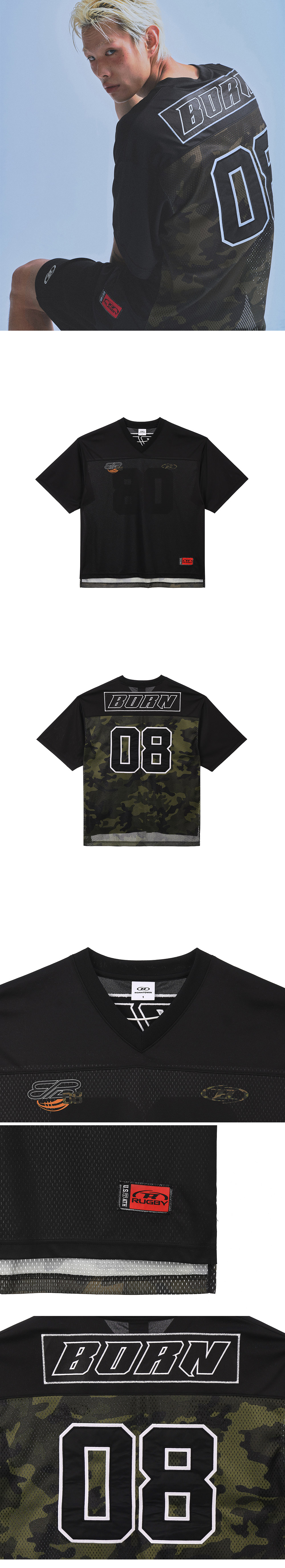 [DETAILS] * 08 럭비 저지 티셔츠 - 흡습속건 폴리메쉬 - V넥 디테일 - 넘버링 아플리케 자수 포인트 - 시즈널 라벨 포인트 - 엑스트라핏 Material : Polyester 100% Fitting : DS 1 Size, 178cm, 70kg