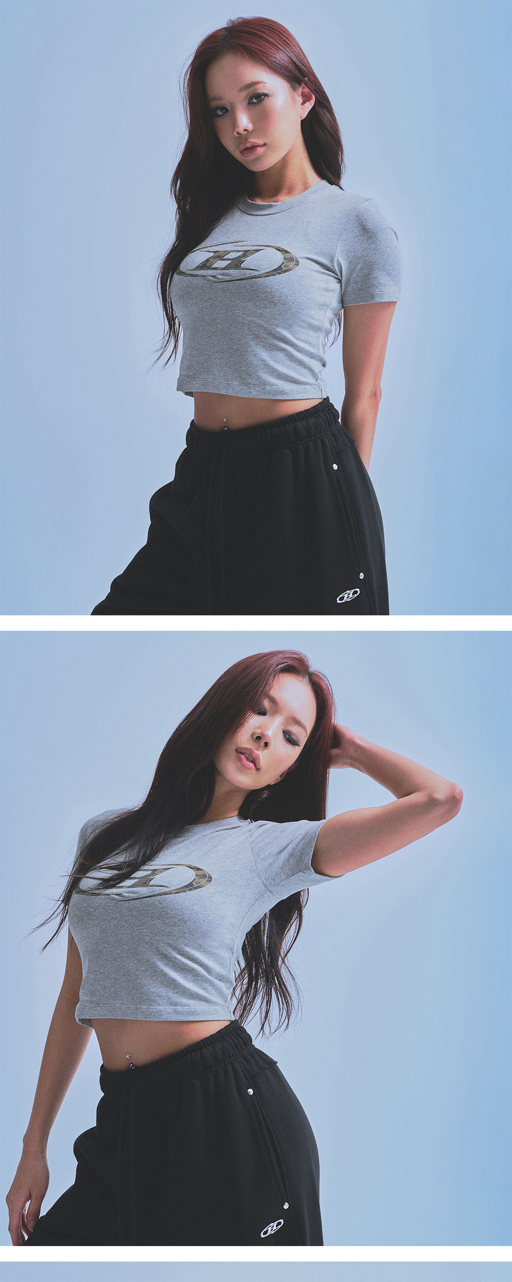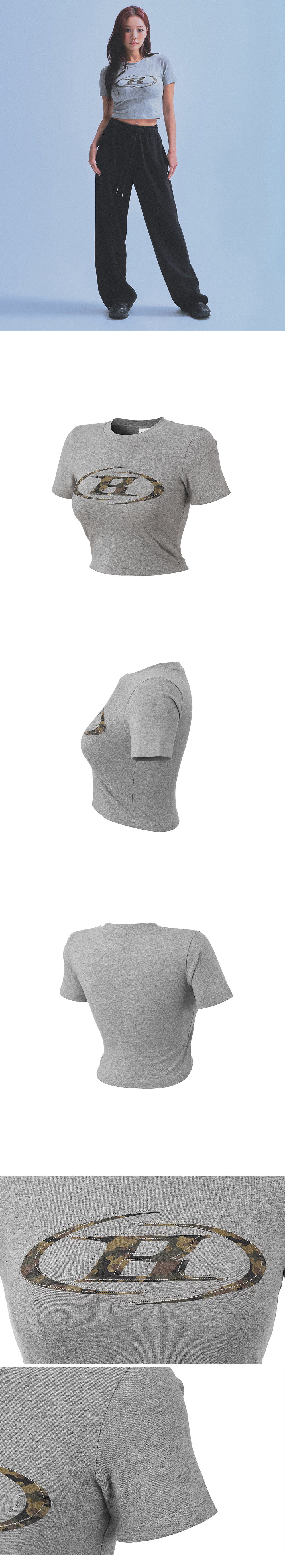 본투윈 우먼스 카모 B로고 세미 크롭 티셔츠 멜란지 그레이