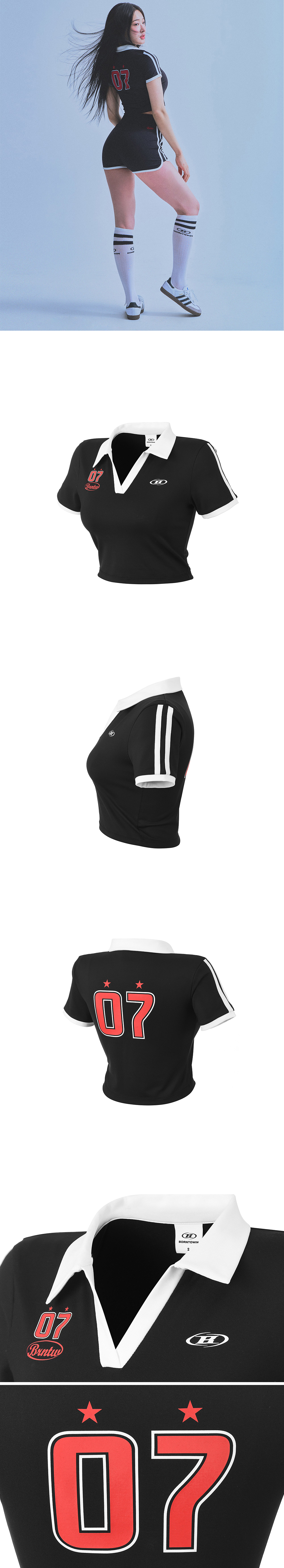 [DETAILS] * BRNTW 카라 크롭 티셔츠 - 오픈 카라 넥 - 컬러 배색 트랙 라인 디테일 - 시즈널 스포츠 그래픽 포인트 - 크롭핏 Material : Polyester 91%, Polyurethane 9% Fitting : DB 2 Size, 171cm, 57kg