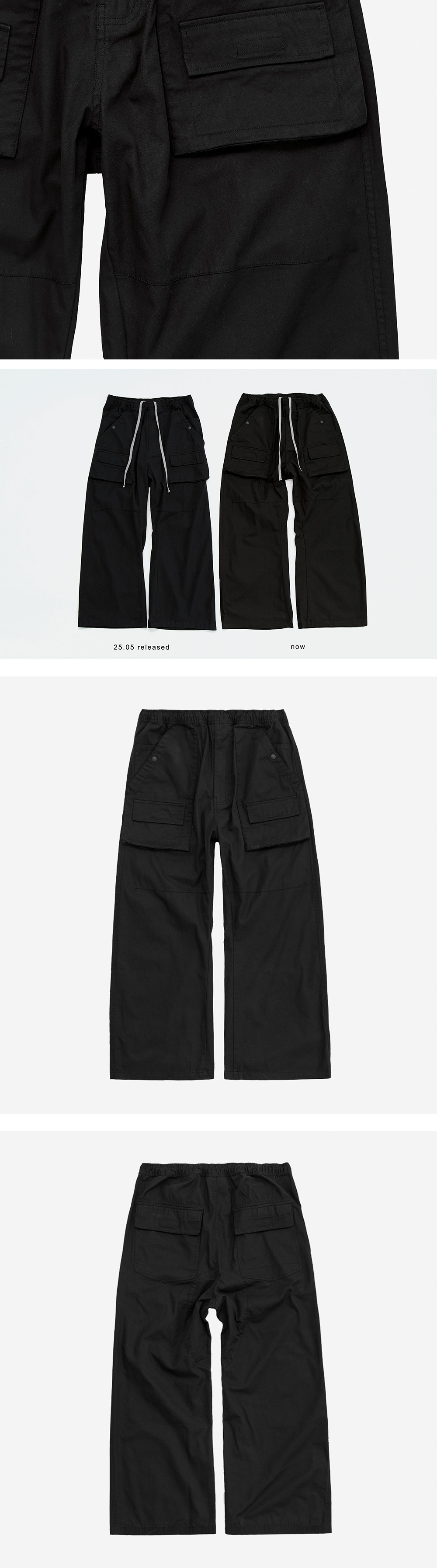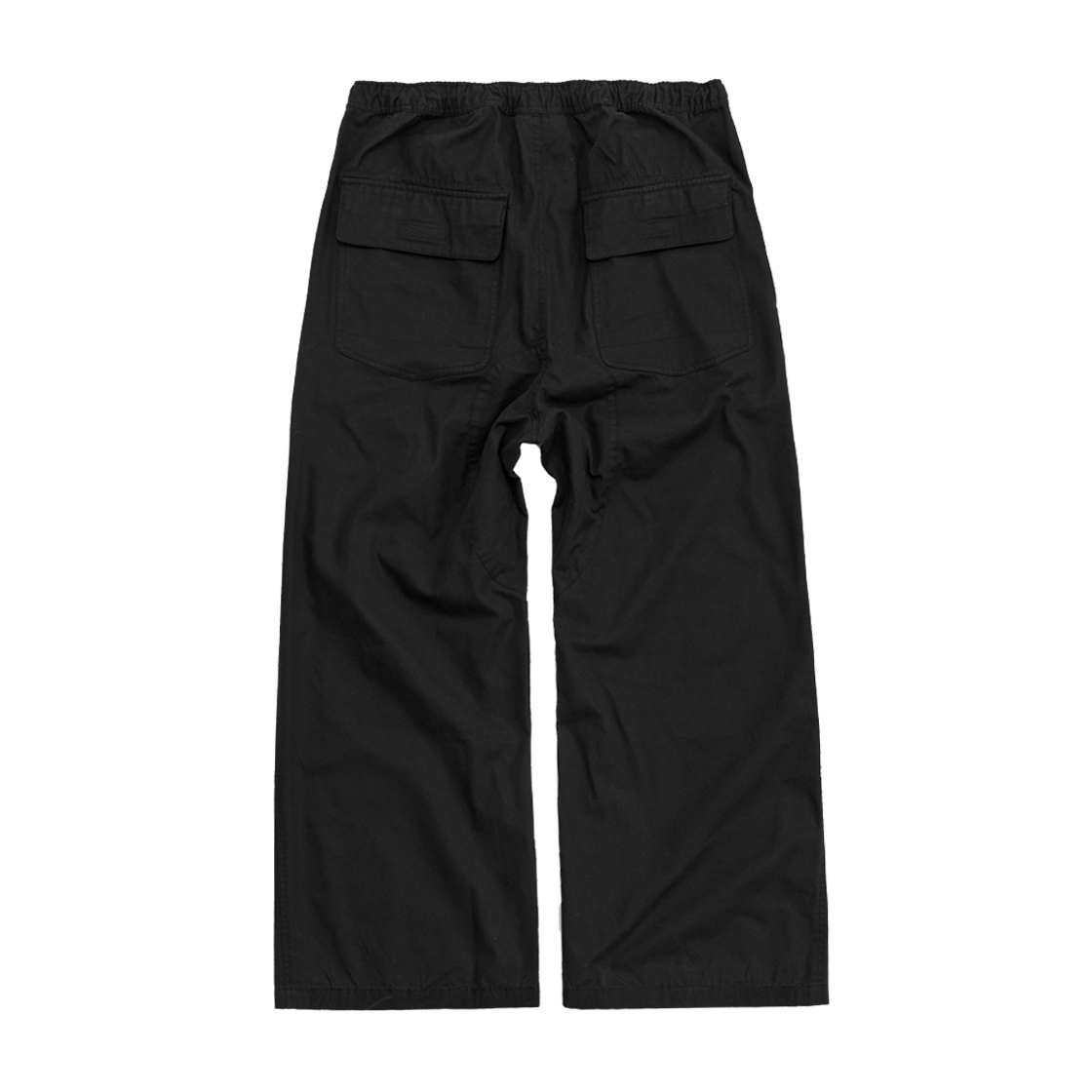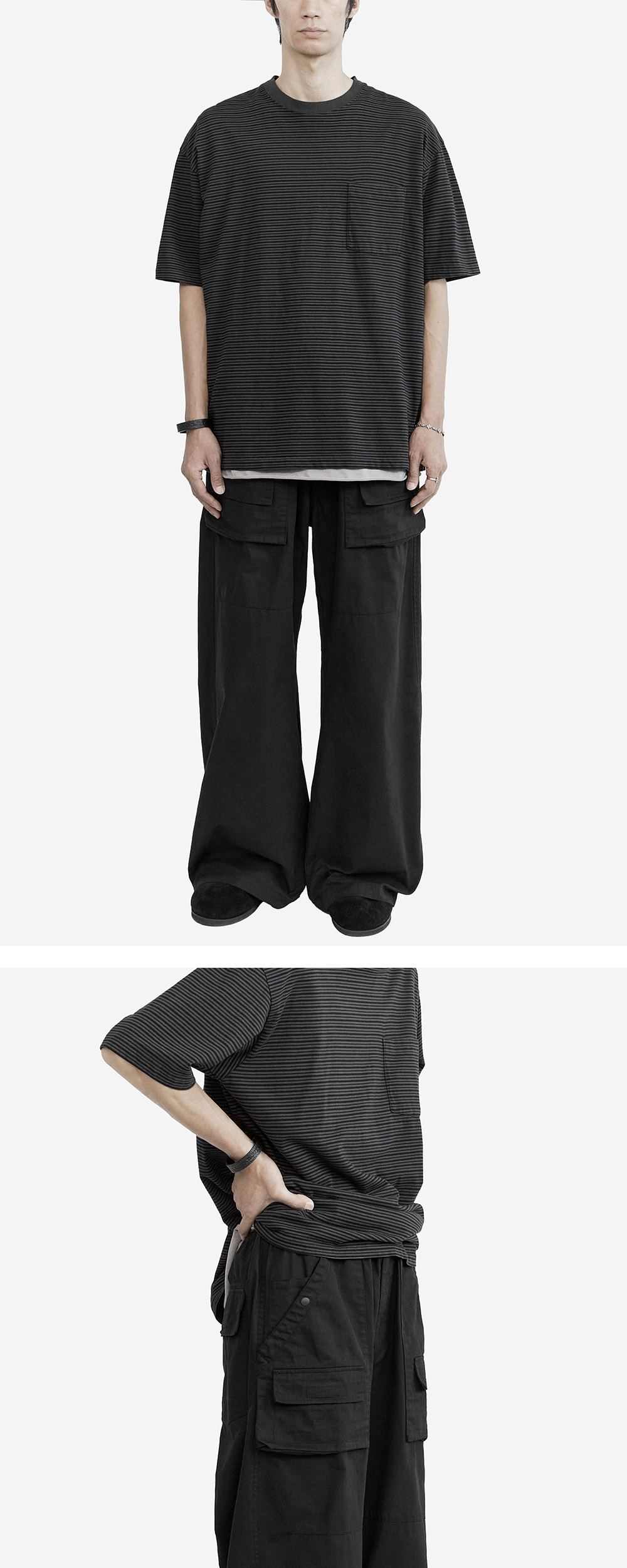 front cargo pajama pants 1.2v 전면 더블 포켓이 적용된 편안한 파자마 팬츠. 전체적으로 넉넉하고 루즈하되, 무릎이 가볍게 잡힌 특유의 실루엣이 특징적. 실루엣은 많은 사랑받고 있는 고시마 팬츠와 퍼티그 스웨트 팬츠 사이 절묘한 균형점을 찾아 새로운 루즈함을 추구한 결과로, 와이드 스트레이트와 루즈한 플레어드 핏 사이쯤에 해당하는 밸런스입니다. 간절기 아우터 및 단품 티셔츠는 물론, 미드기장 아우터 및 셔츠류까지 넉넉한 상의와도 좋은 합을 만들 수 있습니다. 중량감 변경되어 가볍고 편안한 착용감을 가지되, 무너지지 않는 핏감을 구현했습니다. 여름과 전후 간절기 포함 넓은 계절 착용 가능. *가먼트 워싱 제품 특성상 생산 차수마다 색감이 조금씩 변경될 수 있습니다. *금번 차수의 경우, 직전 차수 대비 붉은 빛이 도는 블랙으로 생산되었습니다. *모델: 170 중반 / 마른 체형, 3사이즈 착용