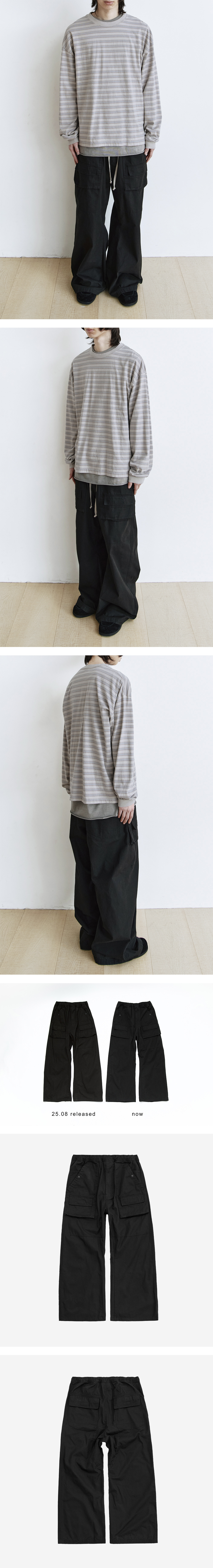 front cargo pajama pants 1.2v 전면 더블 포켓이 적용된 편안한 착용감의 파자마 팬츠입니다. 2개의 공간으로 구분된 전면 포켓과 전, 후면에 적용된 플랩 포켓으로 다양한 아이템을 편리하게 휴대할 수 있습니다. 허리 부분에는 밴딩 처리하여 사이즈에 구애받지 않고 편안히 착용 가능합니다. 실루엣은 많은 사랑을 받고 있는 고시마 팬츠와 퍼티그 스웨트팬츠 사이의 절묘한 균형점을 찾아 새로운 루즈함을 추구한 결과로, 와이드 스트레이트와 루즈한 플레어드 핏 사이쯤에 해당하는 밸런스입니다. 간절기 아우터 및 단품 티셔츠는 물론, 중간 기장 아우터 및 셔츠류까지 넉넉한 상의와도 좋은 합을 만들 수 있습니다. 밑단 뒷부분 덧댐과 전면 지퍼 플라이 등 좋은 체감으로 다가오는 디테일이 적용된 팬츠입니다. 적절한 두께감으로 넓은 계절에 걸쳐 활용이 가능합니다. *모델: 178cm / 마른 체형, 3사이즈 착용 *직전 차수 대비, 금번 차수의 경우 유사한 컬러감, 유사한 피팅감으로 제작되었습니다.