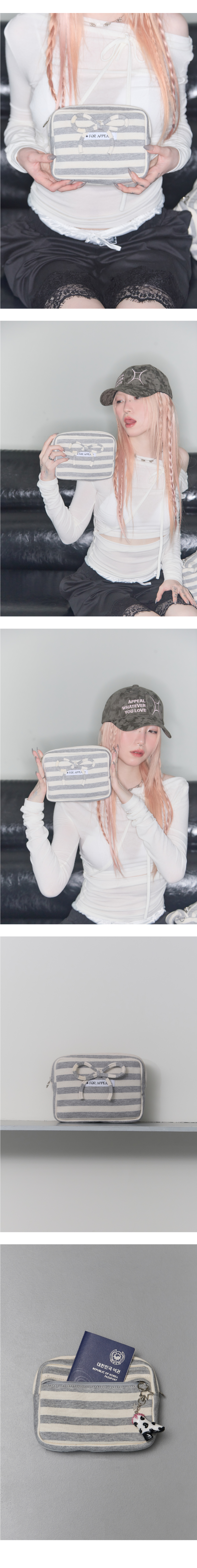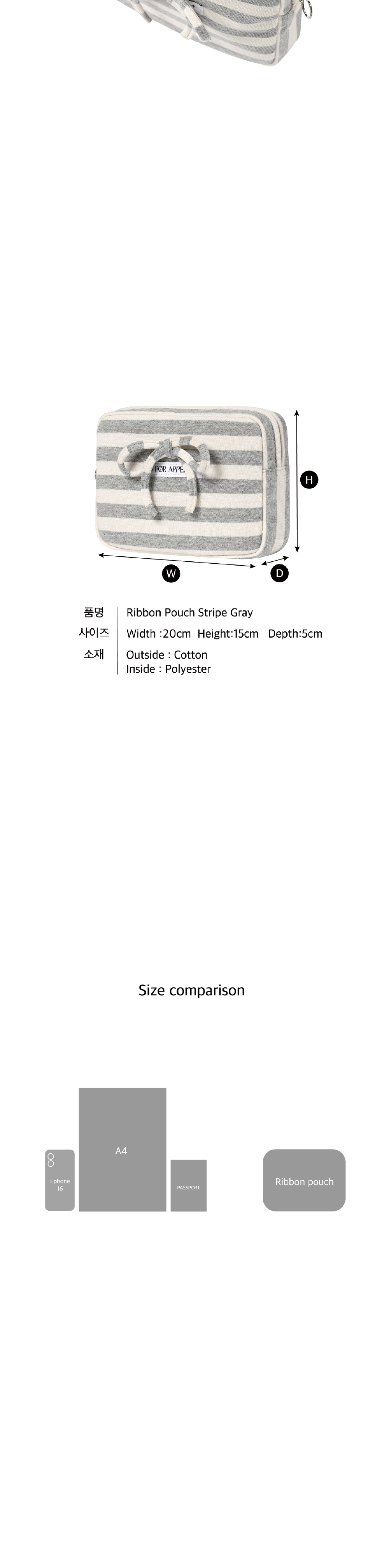 포어필의 데일리 라인인, Ribbon Pouch입니다. 사랑스럽고 키치한 무드를 더해주는 리본 디테일과 도트 패턴이 포인트인 파우치입니다. 리본은 장식용으로, 고정된 형태로 디자인되었습니다. 뒷면에는 지퍼 포켓이 있어 소지품을 분리하여 보관할 수 있으며, 여권이 들어가는 크기로 여행 시에도 유용하게 사용할 수 있습니다. 화장품, 필기구, 여권, 등 여러 소지품을 정리해 수납하기에 적당한 크기이며, 데일리로도, 여행용으로도 편리하게 사용할 수 있습니다.