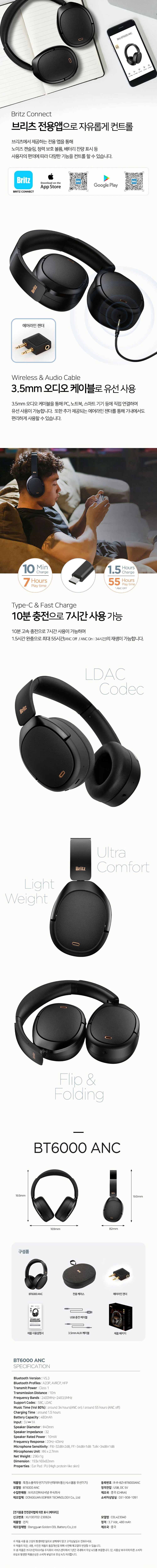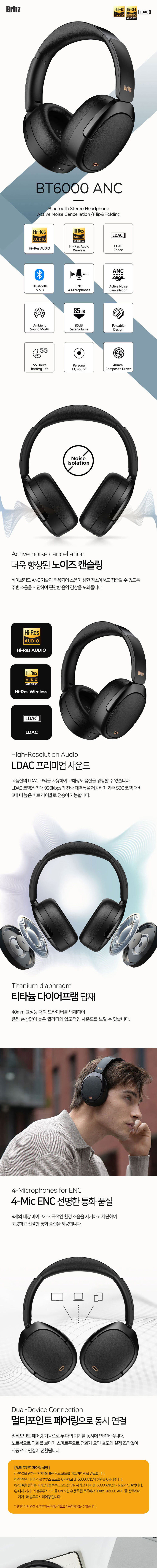 브리츠 BT6000 ANC 블루투스 5.3 노이즈 캔슬링 헤드폰 블랙