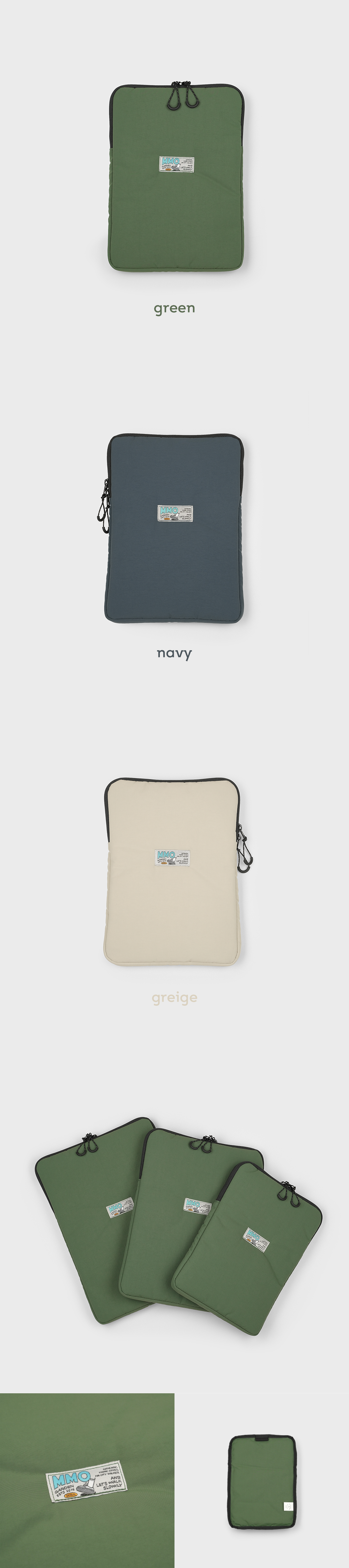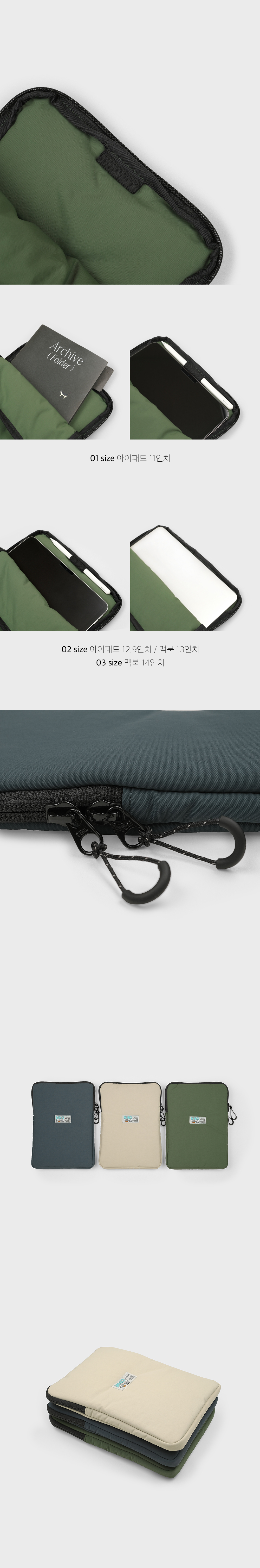 - 매트한 질감에 소프트한 컬러가 매력적인 나일론 원단 - PU 코팅 가공으로 생활 발수 및 방수가 가능 - 4온스 충전재를 사용하여 가벼운 무게, 적당한 두께감과 푹신함 - 에메모 사각 라벨 포인트 에메모 백팩 전용 사이즈로 제작된 태블릿 & 랩탑 파우치 - 075 사이즈 : 01 사이즈 (아이패드 11”) 이외 태블릿 및 랩탑은 아래 제품 사이즈표를 참고해 주세요. 에메모 백팩용으로 무게는 가볍게, 가방 내부 포켓에 넣고 빼기 편하도록 디자인을 최소화하고 수납 시 가방의 형태를 최대한 해치지 않는 사이즈로 제작하였습니다.