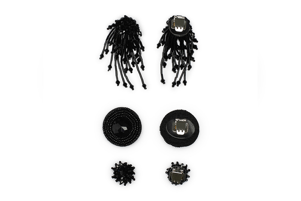 총 3가지의 블랙컬러 핸드메이드 비즈 참으로 총 구성된 핍 세트입니다. 드롭형태의 비즈, 원형태의 비즈, 미니 사이즈 비즈로 다앙한 형태의 신발에 탈부착할수 있도록 클립형태의 마감재를 사용했습니다. *신발은 포함되어있지 않습니다.
