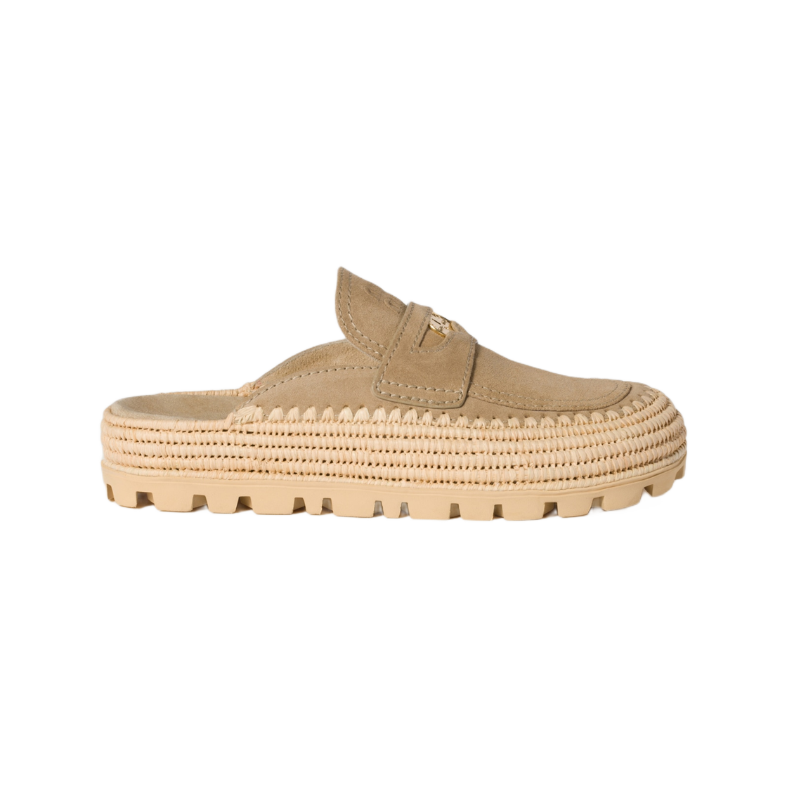 (W) Miu Miu Suede and Raffia Platform Mule Ecru