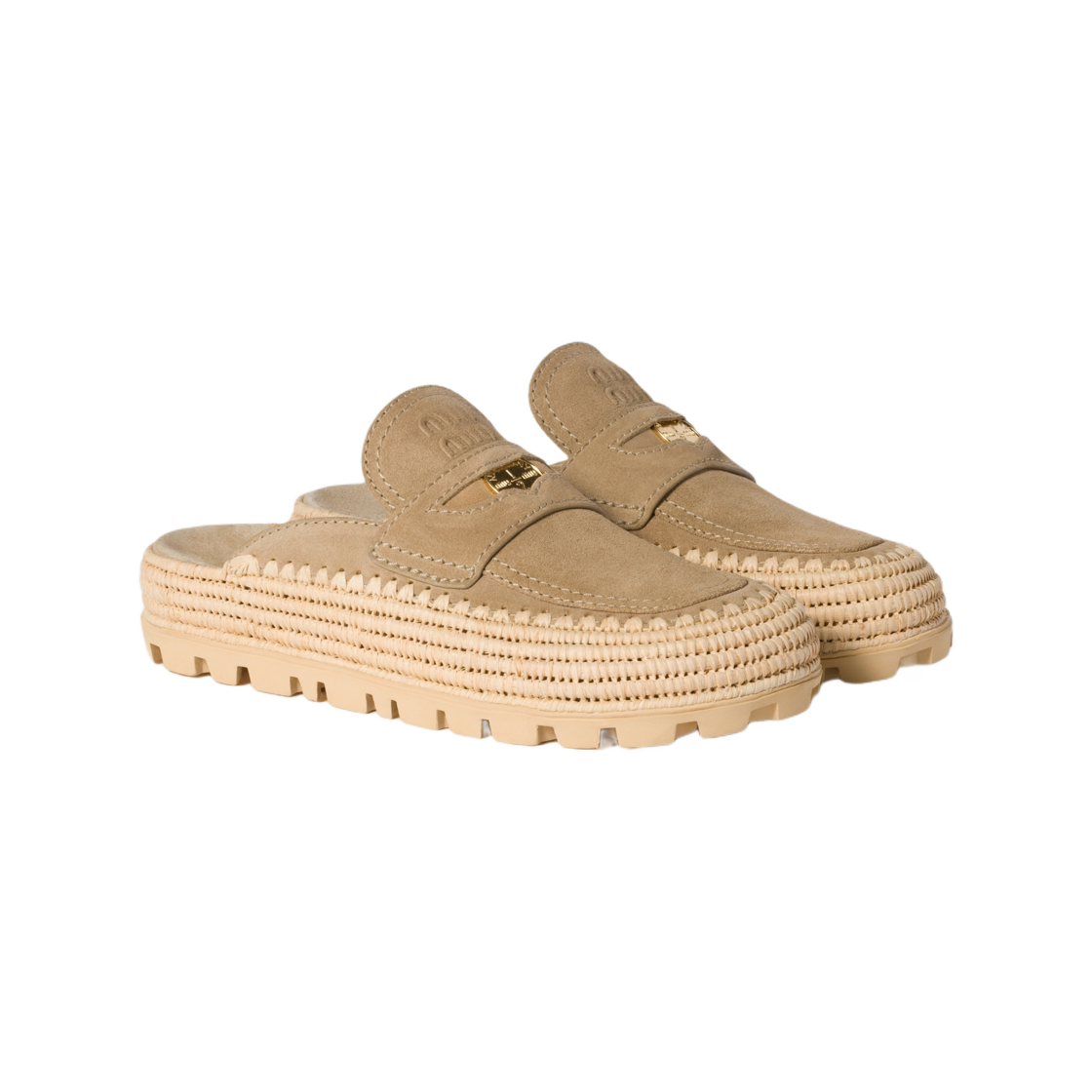 (W) 미우 미우 스웨이드 앤 라피아 플랫폼 뮬 에크루